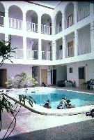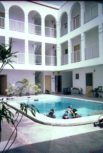 今回、利用したビアンカホテルです。飛行場から近く、10分ほどのところにあります。今回は、ここからすぐそばにある、トヨタレンタカーに行き、カローラを借りて、島の中を走りました。ダイビングショップはホテルの中にあり、このプールを利用して、教習をしていました。日本で免許をとらずに、いきなりサイパンのきれいな海で免許を取る人たちもいます。