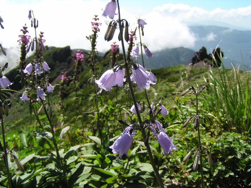 一休みをしてから外輪山を一回りし不動平に戻った、頂上の展望は八幡平方面は雲も無く美しい景色が見られたが、秋田駒、早池峰は雲から頭を出していた、南は雲海が広がっていた。昼食後相談して鬼が城コースを選択しスタートしたがなかなか厳しく岩場で歩きにくかったが高山植物も咲いており、展望も素晴らしく変化に富んだ楽しいコースでした、だが心配はリフトの最終に間に合わせる事で切通しの分岐に付いたときには3分位遅れ、コースタイム通りに行っても10分の余裕しかないため焦ったが黒倉の途中になった所、大勢の登山客に追いついた為一息つけたが、その後コースタイムを短縮し何とか予定時間より早く到着した、後はリフトで降りて網張温泉で一汗流した、温泉は乳白色の温泉で、本当に疲れがどこかに飛んでいった様な気分でした、何とか、平良さん、姉貴にも喜んでもらえたようで良かったと自分なりにも満足した山行でした、ただ日焼けがひどく、温泉が染み渡った今回の山行でした。