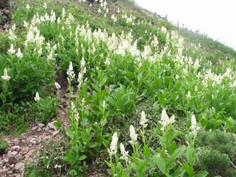 | 当初はロープウェイを使用しないコースを考えていたが、地図上の登山口に入る道探したが分からずグランデコホテルで 聞いた所ロープウェイのコースだけ教えられたが、徒歩で登るコースを聞いたところ教えてくれたが車両進入禁止となって おりやむなく、ロープウェイコースとした。 ロープウェイの終点には犬をつれてゆったりと散歩している姿や家族連れの姿 だけで登山者は見あたらない、西吾妻に登るコースも案内が無く、一度地図を見てスタートしたがどうも分かり難くまたロ ープウェイ駅まで戻り聞きようやく分かりスタートした。 最初はブナの林を進むだけでなかなか展望も良くならず、約1時 間ほど歩いたところ向かい側の尾根が見え登山者が大勢いて展望の良くなった尾根を進むと西大嶺に辿り着いたここも 1981.8mもあり多くの登山者が休んでいた、そこをそのまま西吾妻山分岐まで戻り一路西吾妻山への道を進んだ、こ の斜面は一面にコバイケイソウが咲き誇っており、こんな山の上で湿地帯でもない斜面にコバイケイソウが群生しており 他の花も咲いているがコバイケイソウのみが目立った、焼石岳などもコバイケイソウは多いが沼に多くこれほど高所で一 見乾燥しているような所の群生したコバイケイソウを見るのは初めてだった。コバイケイソウを楽しみながら30分ほど歩く と西吾妻小屋に着いたがその周辺は広い湿地帯となっていた、地図では西吾妻山頂迄30分位りすぐ戻って来る事にし、 そこは通過山頂を確認しリターンし西吾妻付近の木道で高山植物ながら。ワタスゲ等見ながら昼食タイムとした。