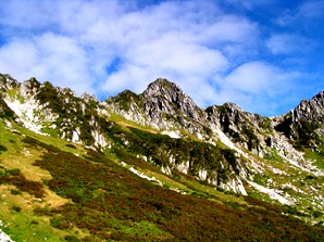 ようと思っていたのがようやく実現すると思うと10週間位落ち着かなかった、妻も気持ちよく進めて くれ、ツアー申し込みまで行ってくれ自分も自分一人で参加するのが申し訳ないような気持ちになって いたが気持ち良く参加させてくれた。 中央アルプスはまだ足を踏み入れていない為中央アルプスの木曽駒ケ岳か木曽御嶽山があったが今回 は木曽駒ケ岳にした。 自宅から北上インターまで車で行きインターでバスを待ったがバスが中々来ないため、買ってきた夕 食の弁当を食べていたところタクシーの運転手が自分の名前を呼びタクシーに乗り換え古川でバスに乗 り換える旨説明あり、早速乗換えをしたところ、盛岡より2名の女性がすでに乗っていた、運転手の話 では、岩手の参加者が多いときはマイクロバスになるが、少ないときは今回のようにタクシーとの事、 古川でバスに乗った時には数人だったが仙台、福島,郡山等途中で参加者を乗せてバスがほぼ満席にな るくらいだった、比較的中年の女性が多いようだ。車中泊ということで、疲れの残さないように眠ろう と思うが中々寝付かれず、いくらかウトウトしたぐらいで薄明るくなり目が冴え出し、萱ノ台に到着し たそこで路線バスに乗り換えて山道を登りロープウェイの駅に着いたが駅は大勢の人でごった換えして いて、ツアーの人達は順番を待ち分乗し乗り込んだ、ロープウェイからの風景は遠景はあまり見えず、 滝やら花やらに目が奪われたが千畳敷について登山道を眺めたところ登山者の列が続いていた、登山者 も駒ケ岳に登る登山者、千畳敷カール周辺を散策するハイカーに分かれていた。 少し登り始めると雲海の南側に南アルプスの連山や富士山が展望できた。南アルプスは何度か登った 経験があり北岳、間ノ岳、農鳥山の白峰三山、鳳凰三山、甲斐駒ケ岳、仙丈岳大体あの山と確認がと れ、走馬灯のように頭の中を、登った時の事や仲間の顔が思い出された、とても懐かしくそれも何十年 も前の出来事のようには思えませんでした。
