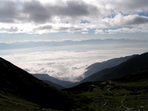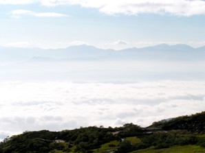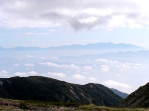雲海に浮かぶ南アルプス1 雲海に浮かぶ南アルプス2 歩き始めて40分ぐらいで尾根の宝剣山荘に辿り着いたが進みは遅く団体ということもありペース を合わせるのにじれったくなる気持ちを南アルプスを眺め思い出などに浸っていた、少し進んでは、み なが追い付くのを待っての繰り返しで中岳に着いたところ雲海の中に木曽御嶽山が目の前に迫ってい た、来年はあそこに登ろうと思いながら登山道に隣接するコマクサを眺め歩みを進めたここのコマクサ は人手で植えたのかと思うほど少なく、囲われており、秋田駒、岩手山を見ていると何か哀れを感じる ようでした、約1時間30分位で目的地の木曽駒ケ岳に到着 そこからは八ヶ岳も見え、また回想が始ま った、1人で八ヶ岳を眺めながら軽食をとった、残念ながら北アルプスは見ることが出来なかった。