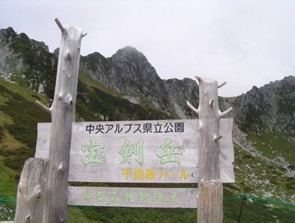 木曽駒ヶ岳で 千畳敷カールより宝剣岳と看板 |