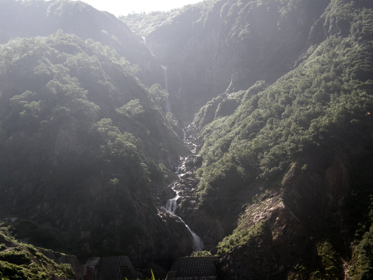 日本三名山とも言われる白山、高山植物でも白山の付くものも多く楽しみにしていた、夜行バスで別当出合いに着き、準備体操後スタートいきなり大きな吊橋を渡り、歩を進めると目に入ったのはスケールの大きな、落差の高い滝の連続、その下方には、10段以上と思われる砂防ダムの連続、折角のスケールの大きな素晴らしい滝の景観がその砂防ダムで悪くしていると思いながらも見事な滝の連続に見とれた。後で調べたところ不動の滝と言うらしい。 |