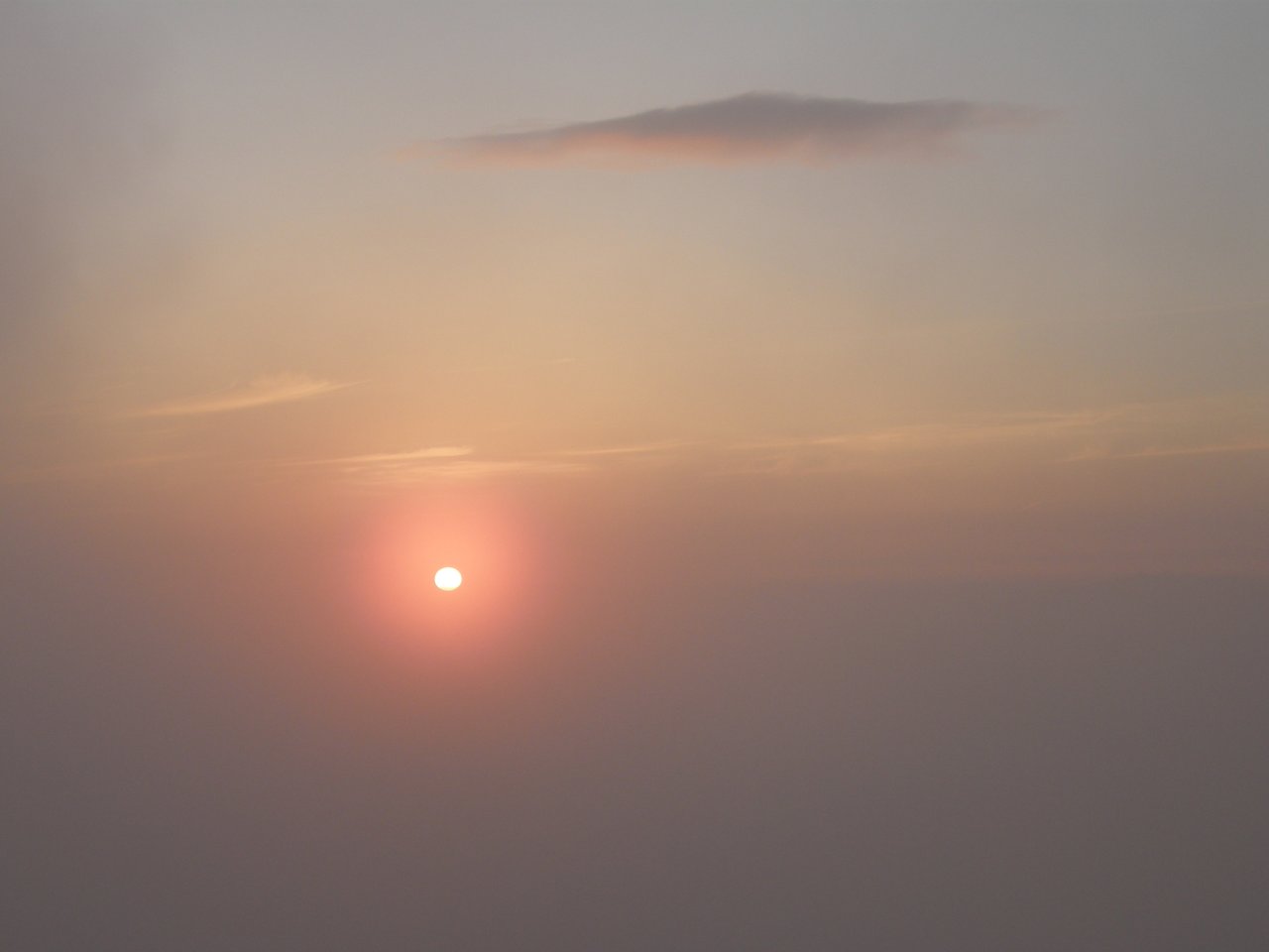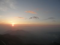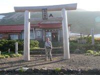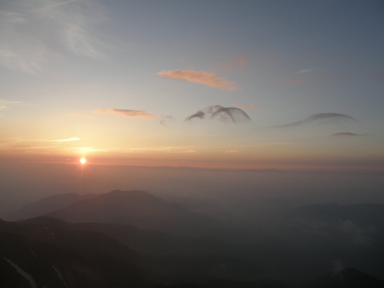 朝3時半頃より山小屋は騒然となり目が覚めた、外を見ると天気は良く星空が広がっていた。4時になって奥宮から太鼓の音が響き、ご来光が見られる合図ということで、すぐに起き出し再び山頂を目指し出発した、大勢の人達が黙々と山頂を目指していた、中には神主さんが白装束で足駄スタイルで登ってくると、シャッターチャンスを待っていたが、自分達はそのまま山頂を目指した、ご来光の出る前に神主が登頂して来て、大きな岩の上に立ち、周辺の山々を解説始めた、御岳山、槍、穂高等、そしてご来光が出て、皆から歓声があがった、その後、急にガスが上がりご来光を包んだ、幻想的な光景だった、神主からはこれはこれで素晴らしいご来光と解説があり、その後、日本の未来と、この場に集まった人達の前途と健康を祈念し万歳三唱して、ご来光ショーは完了となった。 |