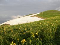 飯豊山を出発して駒形山を過ぎるとニッコウキスゲを中心とした高山植物の群生は見事なものだった、殆んど時間も気にならずカメラを高山植物の群生に向けていた。チングルマは咲いた後の毛が車のように丸くなったものが群生するところがあるかと思えば、今が盛りと咲いて群生している場所、登山道はや斜面はニッコウキスゲでオレンジ色に染まっているようだが、登山道側には、ハクサンコザクラ、イワカガミ、ミヤマシオガマ、アオノツガザクラ等名も知らない花も種類はかなり豊富でまるで自分を御西小屋まで案内してくれているような気持ちになった、斜面にはまだかなりの雪渓がありその雪渓には巨大なクレパスも見られた。思ったより御西小屋には早目に到着し、宿泊の手続きを済ませ、眠る場所を確保して、体を少し休めた。