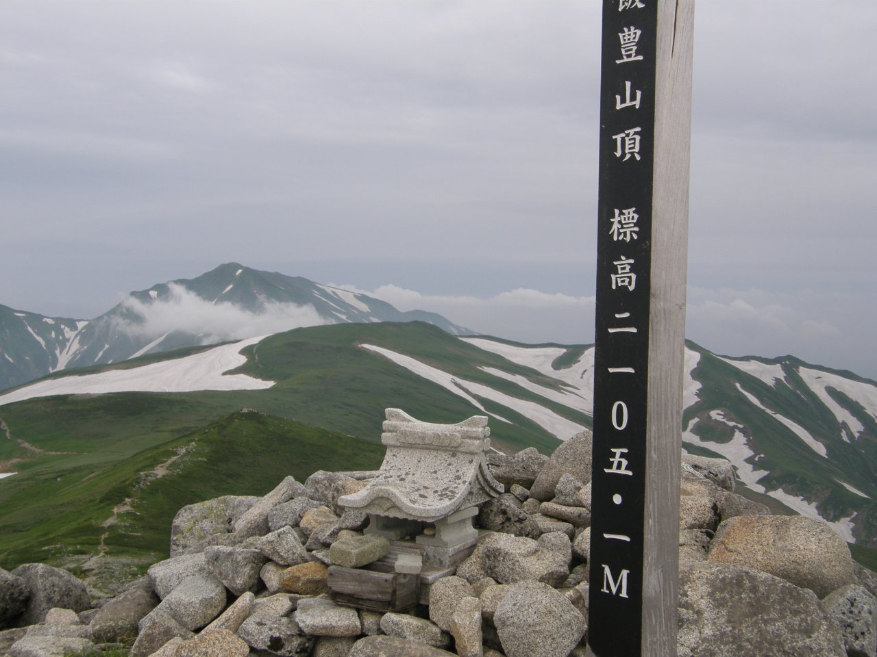 下山時は登るときよりも余裕が出来、登る時に見えなかった物も見えた気がした。本山小屋には前日は100名が泊まったと聞かされたので、小屋の中も見物したが、かなり詰め込まれた様だと感じた、徐々に飯豊山も遠くなり何かこのまま下山することが惜しいような気さえした、休む時など摂津さんに他のコースの事を聞き、また歩くときにはバランスの取り方、雪渓の下り方など教えて貰い、かなり勉強になった。今まで自己流で山に登っていた為、参考になることが多くあった。地蔵岳までは追い越したり追い越されたりを繰り返していたが、地蔵岳からは下り一方で追い着くのは諦めて、マイペースで風景、花を楽しみながら下った、大日杉登山口に到着したのが11時前と自分の予定より3〜4時間早かった、登山口で摂津さんが待っており、途中の温泉で汗を流してから帰る事とした。車で移動し途中の温泉で汗を流した後、摂津さんと別れ、新庄に単身赴任している弟のマンションに寄り一緒に酒を飲み翌朝帰宅した。まるで夢のような2日間だった。