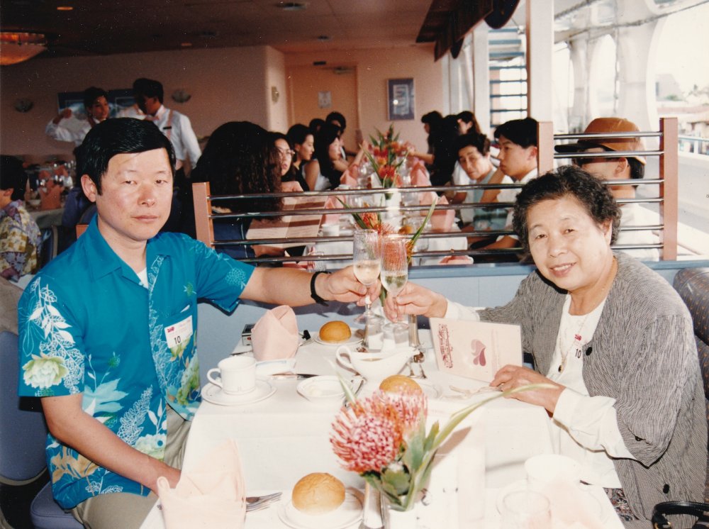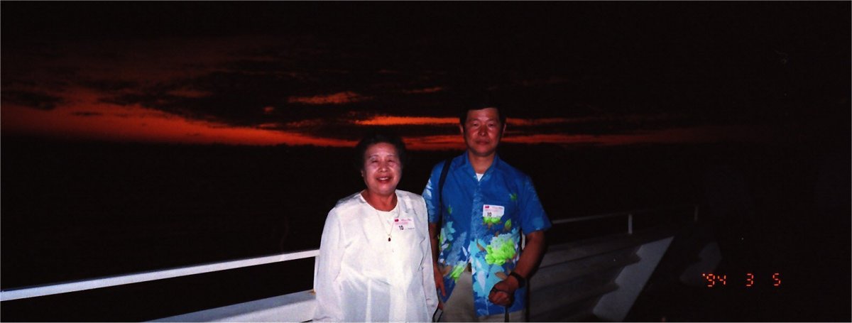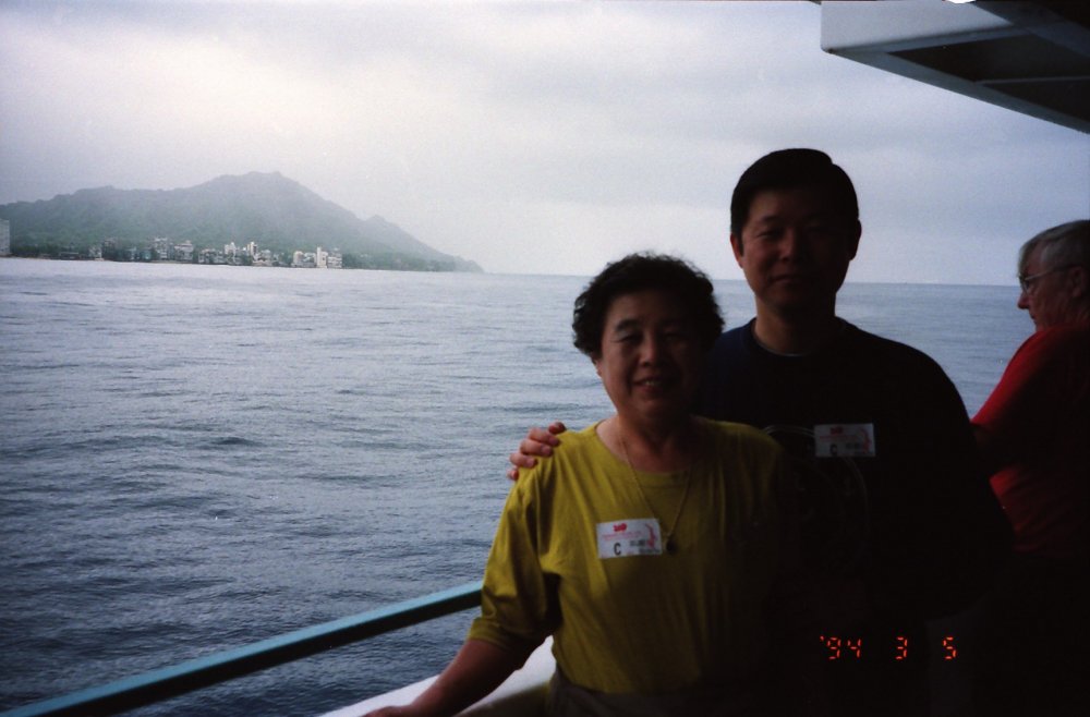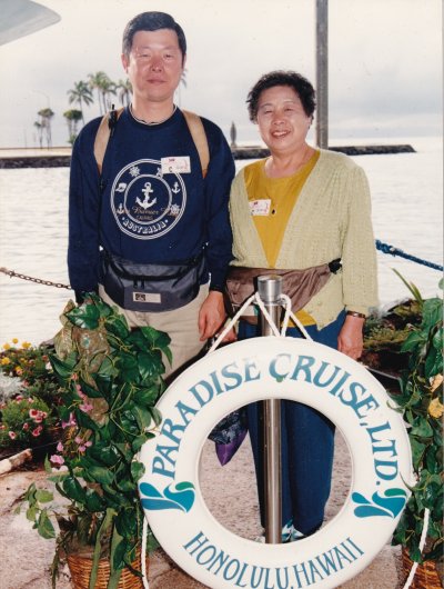 真珠湾クルーズの船の入り口で記念写真。スターオブホノルルに乗りました