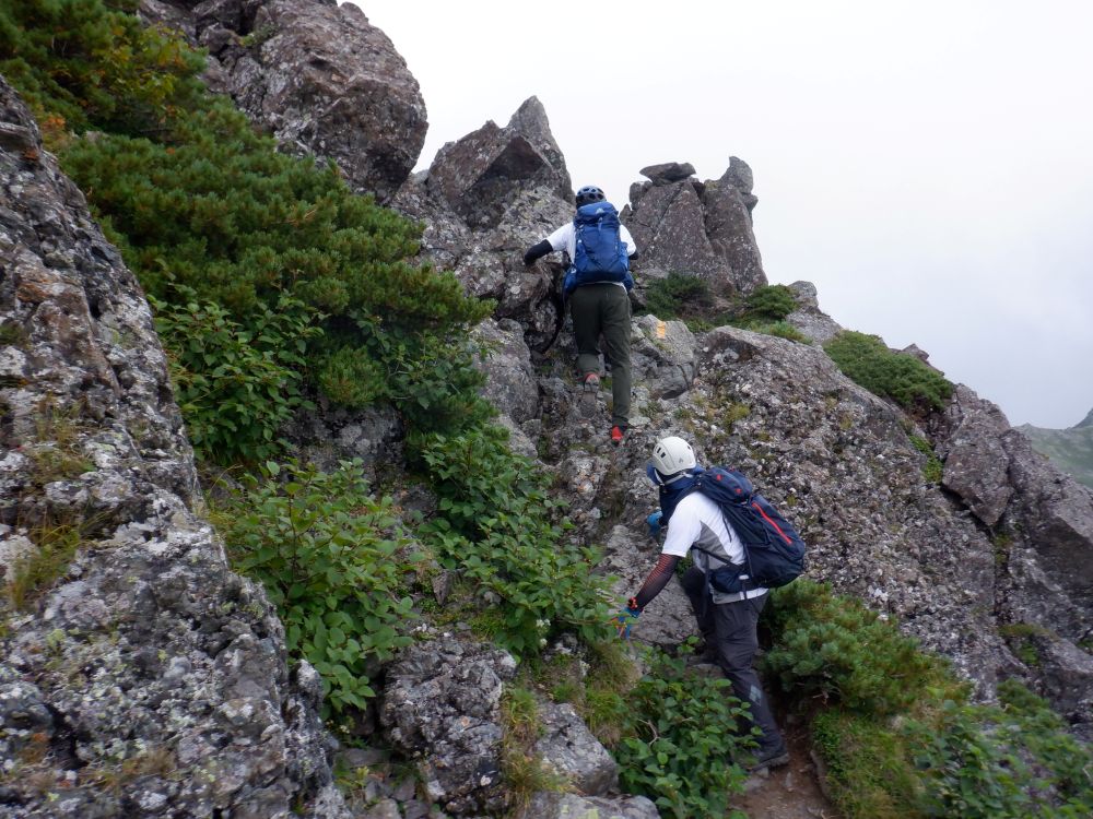 小屋泊で翌日三伏山から本谷山を越えて塩見小屋2753mに到着、ザックをデポし急登のガレ場の岩場を慎重に登り塩見岳西峰3047m・塩見岳東峰3052mへ、360度の大パノラマを満喫しました、