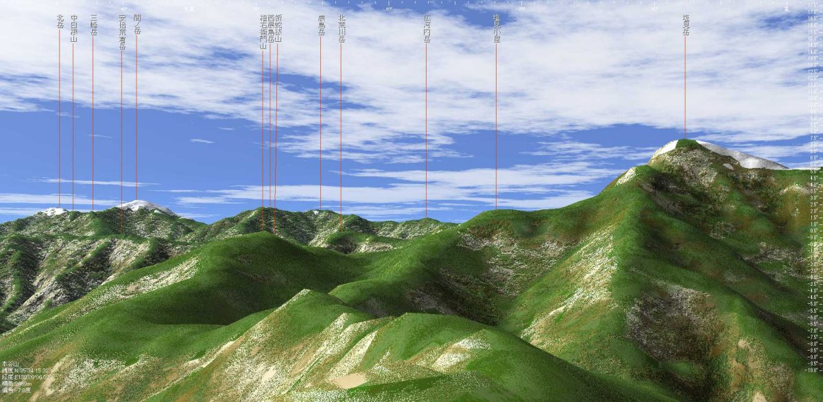 仙丈ケ岳・甲斐駒ヶ岳・北岳・間ノ岳・農鳥岳・千枚岳から荒川三山が見え、中央アルプスも良く見えていました。