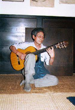 マスター(山宮博史)のプロフィール 渓流釣りの名人 ギターの玄人 山荘オーナ 麓では茶房「アランフェス」を営業している。写真は山荘の囲炉裏の所でギターを弾いている所。 このホール??の壁には近くの渓流で釣り上げた魚の魚拓 がぎっしりと展示してある。吉岡さんのも有りました。 |