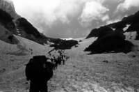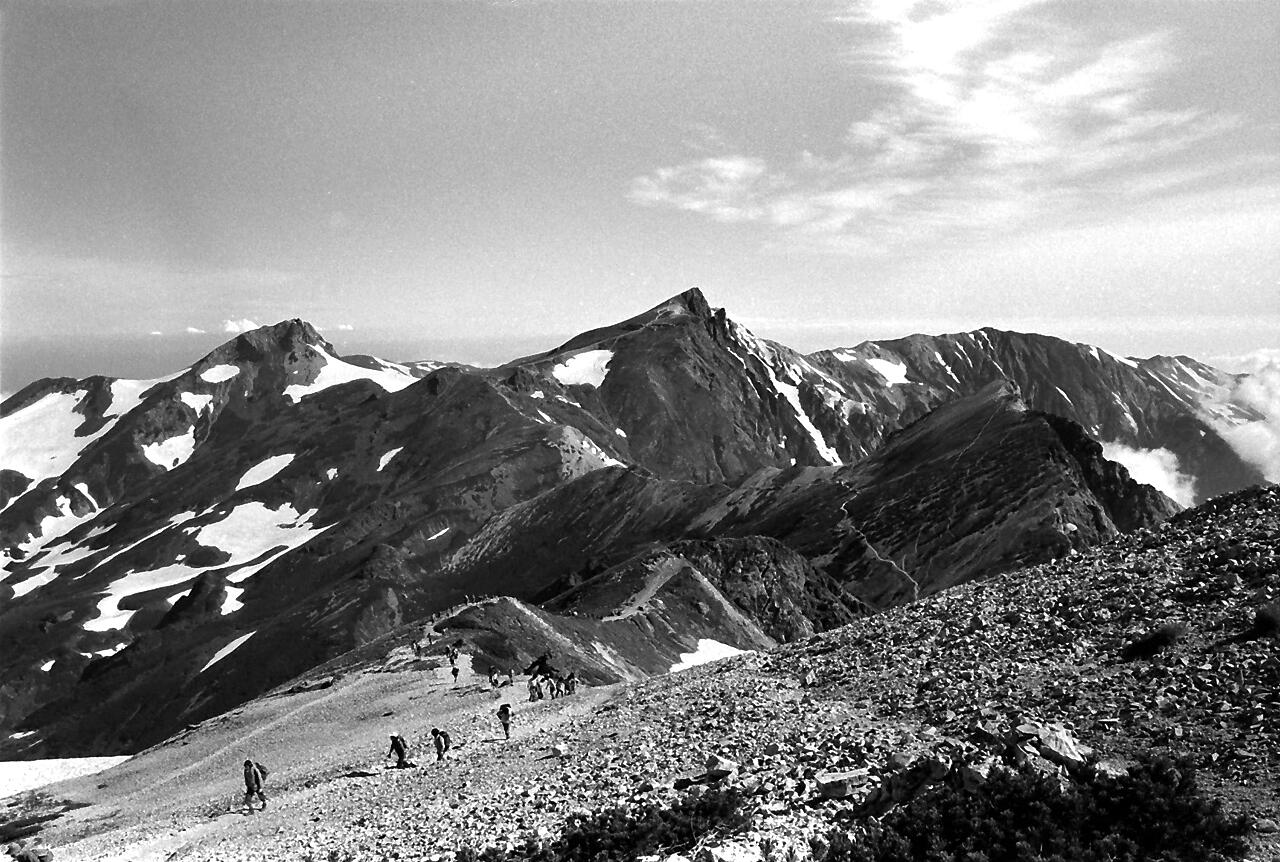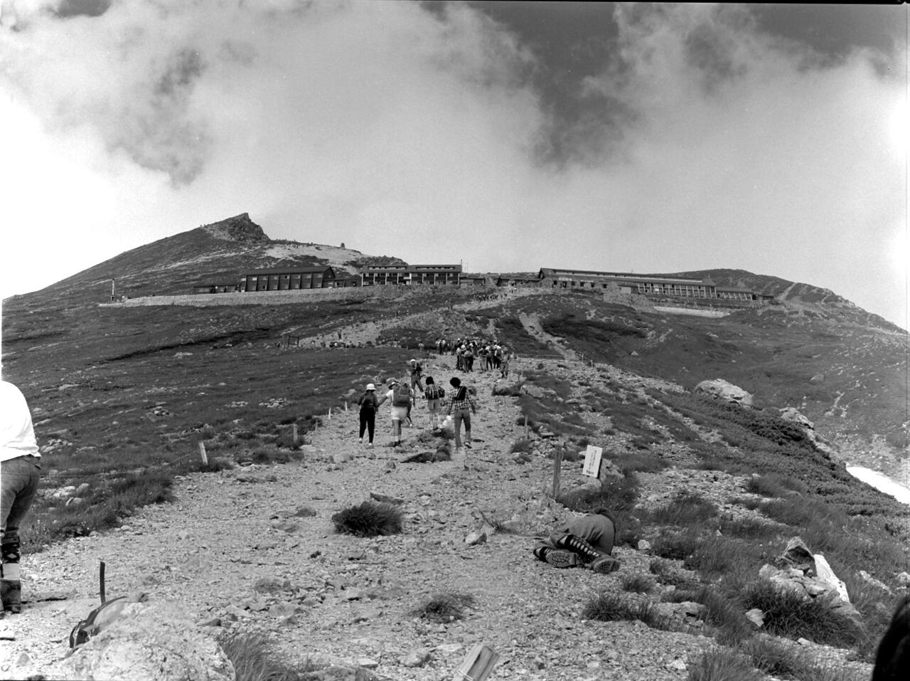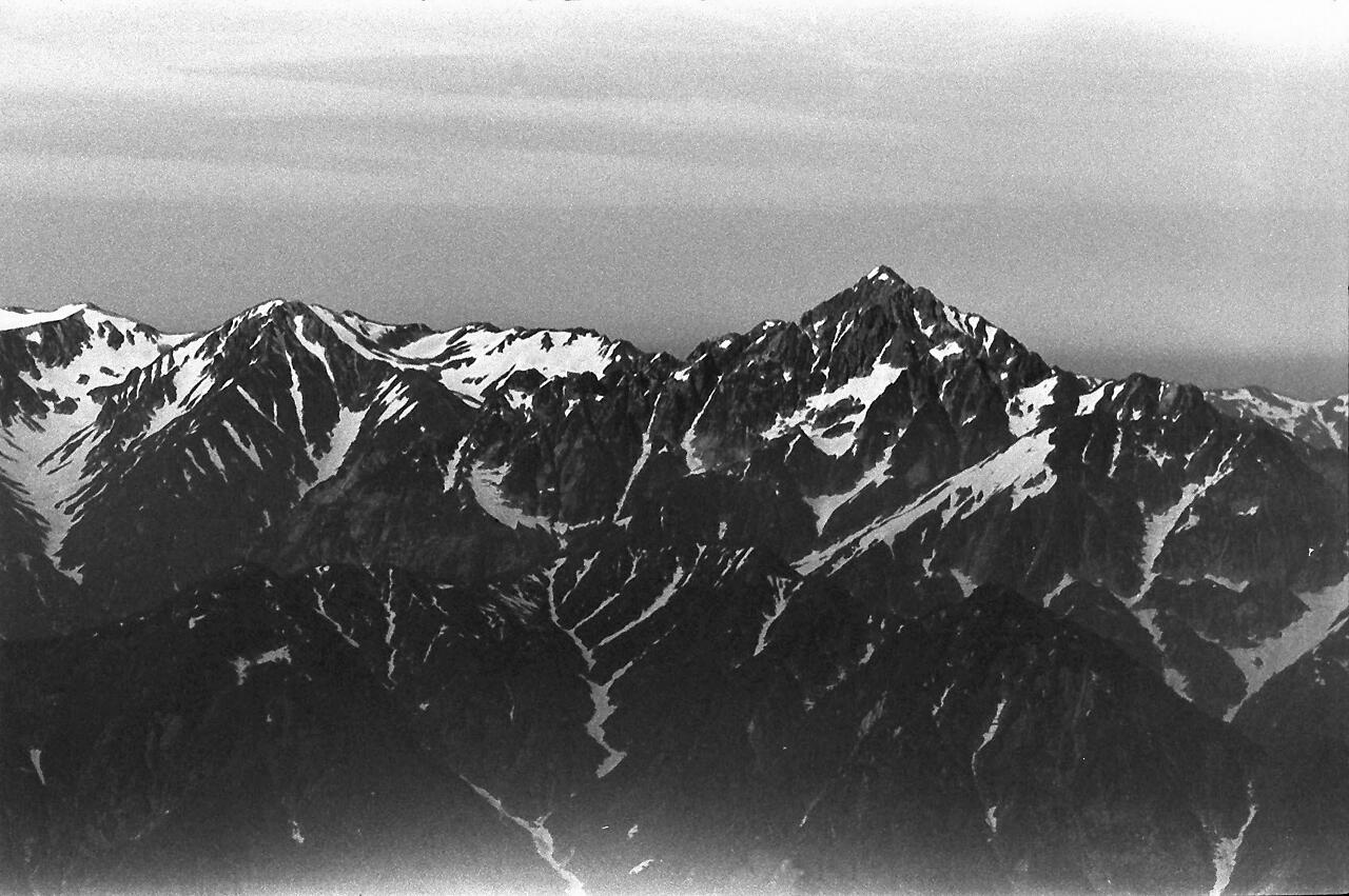 思い出: この登山は40歳の時でした。相棒は平良さんでした。十分に元気。夜行の列車で白馬まで。バス乗り換えで猿倉荘。雪渓の登りは混雑していてゆっくりと。天気も良く写真も沢山。当時は、自宅に暗室を作り、全紙パネルを現像していました。今思えば週末に夜行で登山に、平日は帰宅後、現像して遊んでいました。唐松岳から八方尾根を下り、何とか頑張り、夜行で東京まで。月曜日には会社でした。とても楽しい日々でした。