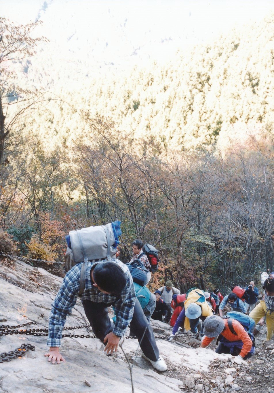 個人的には20年振りに来た。駅前の売店で酒、ビールを買う。駅から少しの間は舗装された登りの道を歩く。農家は見当たらず新築の民家ばかり、分岐から山に入るが中高年者が多い。泥道のすべりそうな急坂を登る。杉渕君が8mmカメラで撮影している。くさり場は人混みでしたが100mほどの長さを登る。頂上は狭いが何とか座り昼食を取る。今日は武甲から周りが良く見えた。縦走路に出たが杉ん゛両側に立ち並び何も見えない。前に来た時は見えたと思うが。家に帰ってから写真を見直ししたら前回は活動記録へ1977/4/8で30歳の時で確かに杉の苗木があり、良く見えていた。子の権現も本堂、大ワラジも、今回は場所が変わっていた。