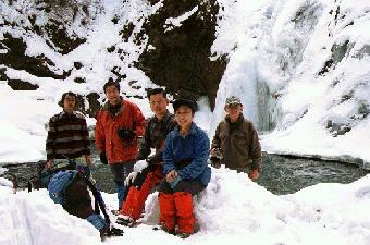 渓谷の中を進む 林道を20分歩き渓谷にはいるところでアイゼンを装着。雪があったが少なかった。五段の滝は20%程度凍っていた。滝に降りて記念写真。不動小屋跡から登り軌道跡に着いたところで昼御飯。11時50分〜12時30分。軌道を歩き渓谷入り口に戻る。3時15分 タクシーで三富村村営温泉に入る。笛吹きの湯。アルコールの飲めない温泉。4時45分にタクシーを呼び塩山に向かう。5時48分発で立川行きで行く。家に着いたのは20時。 |