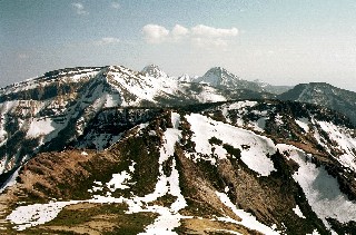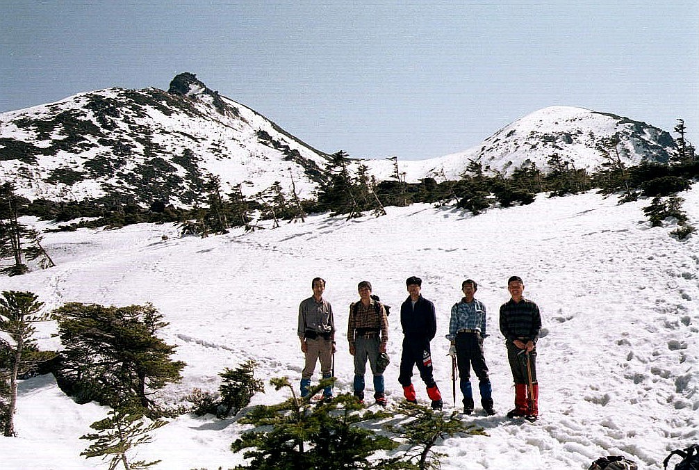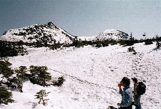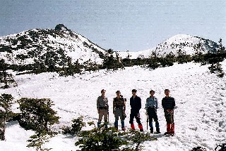 東京を朝に集合して自動車で中央高速経由で渋ノ湯へ向かった。朝早いにもかかわらず道路が混んだので渋ノ湯へ着いたのは10時50分だった。車を駐車場へ預け登山開始。樹林帯の中は雪が硬くなり滑りやすかったのでさっそくアイゼンを付けた。2時間程でヒュッテへ着いた。さっそくテントを設営し登山準備にかかる。サブザックに簡単な食事と酒をつめて出発。写真の左側の中山峠から登った。