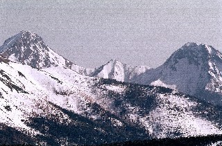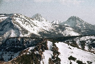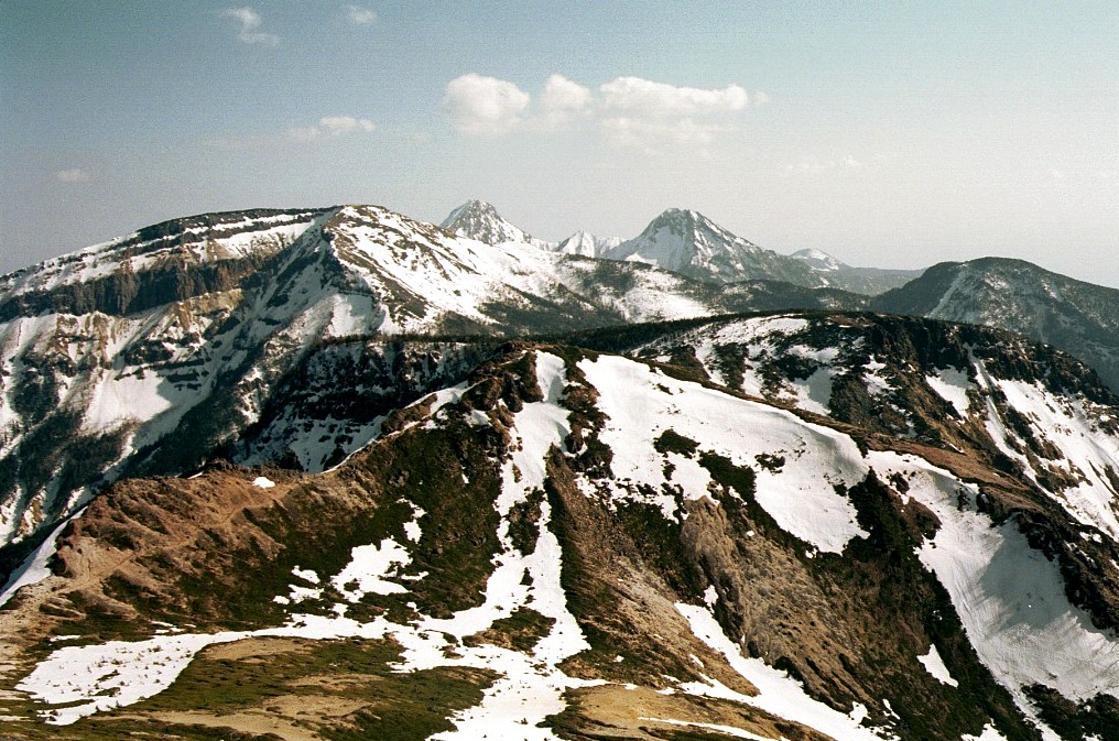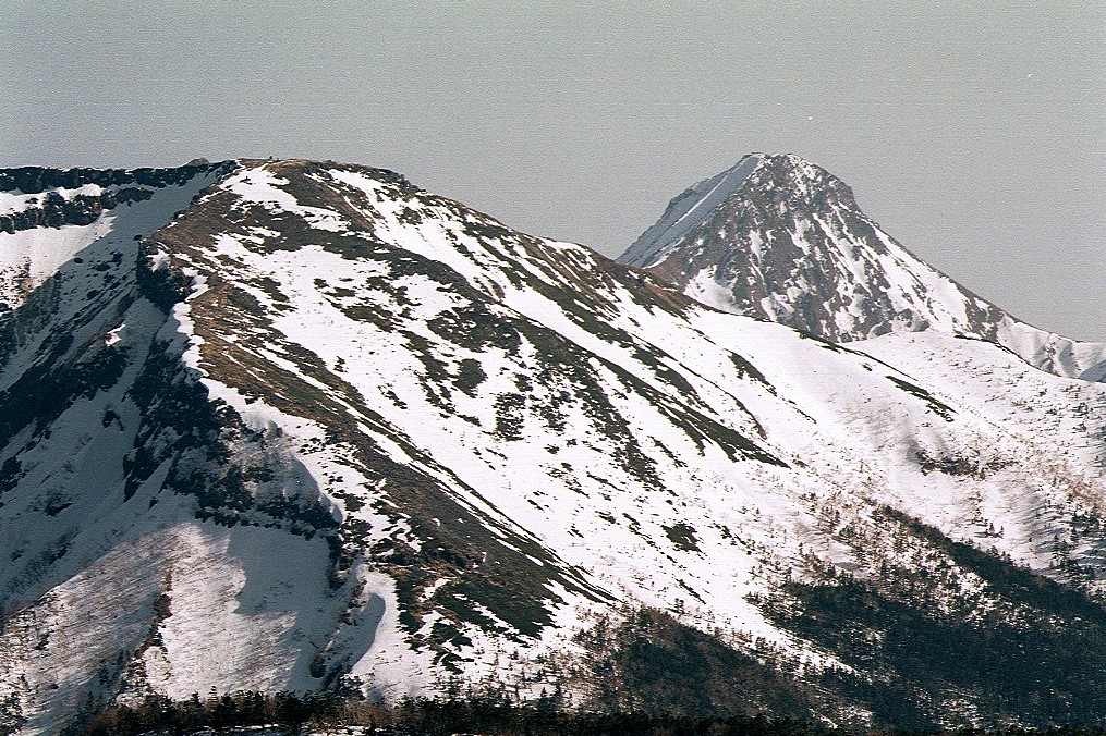 途中で斜面のきつい所があったが気持ちよく歩けた。頂上の手前の大岩の付近から鎖場になったが雪に埋まっていたので慎重に登る。 3時30分標高2645mの東天狗岳に立つ。素晴らしい展望が開け八ヶ岳の赤岳が良く見えた。残念ながら高気圧の影響で更に遠くの方は靄のようなもので見えず,本来は北アルプスも見えるはず。夏沢峠から硫黄岳の縦走路が続く。