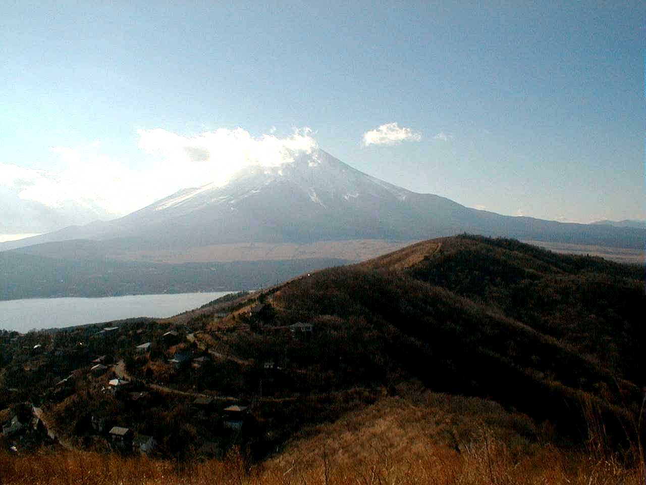PIC00033s.jpg (27434 バイト) その間に日本酒を2本飲み干した。最後はうどんを入れて煮こんだ。それも美味しかった。写真だとわかりにくいが先日登った滝子山が遠くに大変よく見えた。それと小金沢連邦の黒岳,雁が腹摺り山みえています。食後、富士山をバックに記念写真。残念ながらデジタルカメラの自動露出はこの程度しか露出が得られませんでした。データをソフトで加工しましたが元々無い画像は出ません。