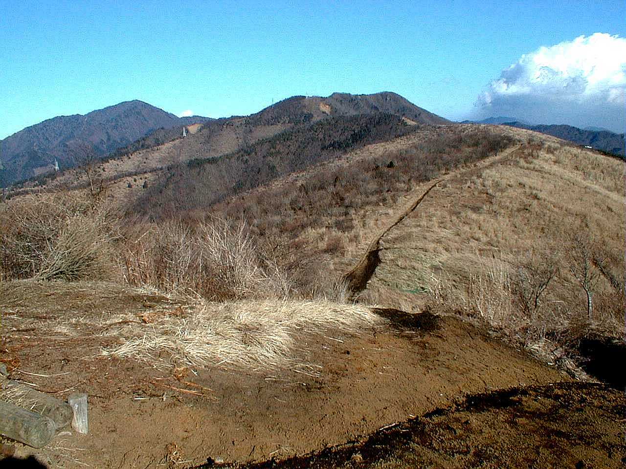 PIC00047s.jpg (25989 バイト) 平尾山から縦走路を振返り石割山を見たところ。平になっている所の左端が石割山の頂上です。左の奥に見える山が御正体(1681.6m)です。