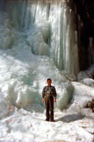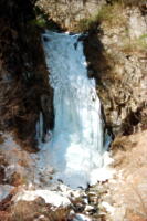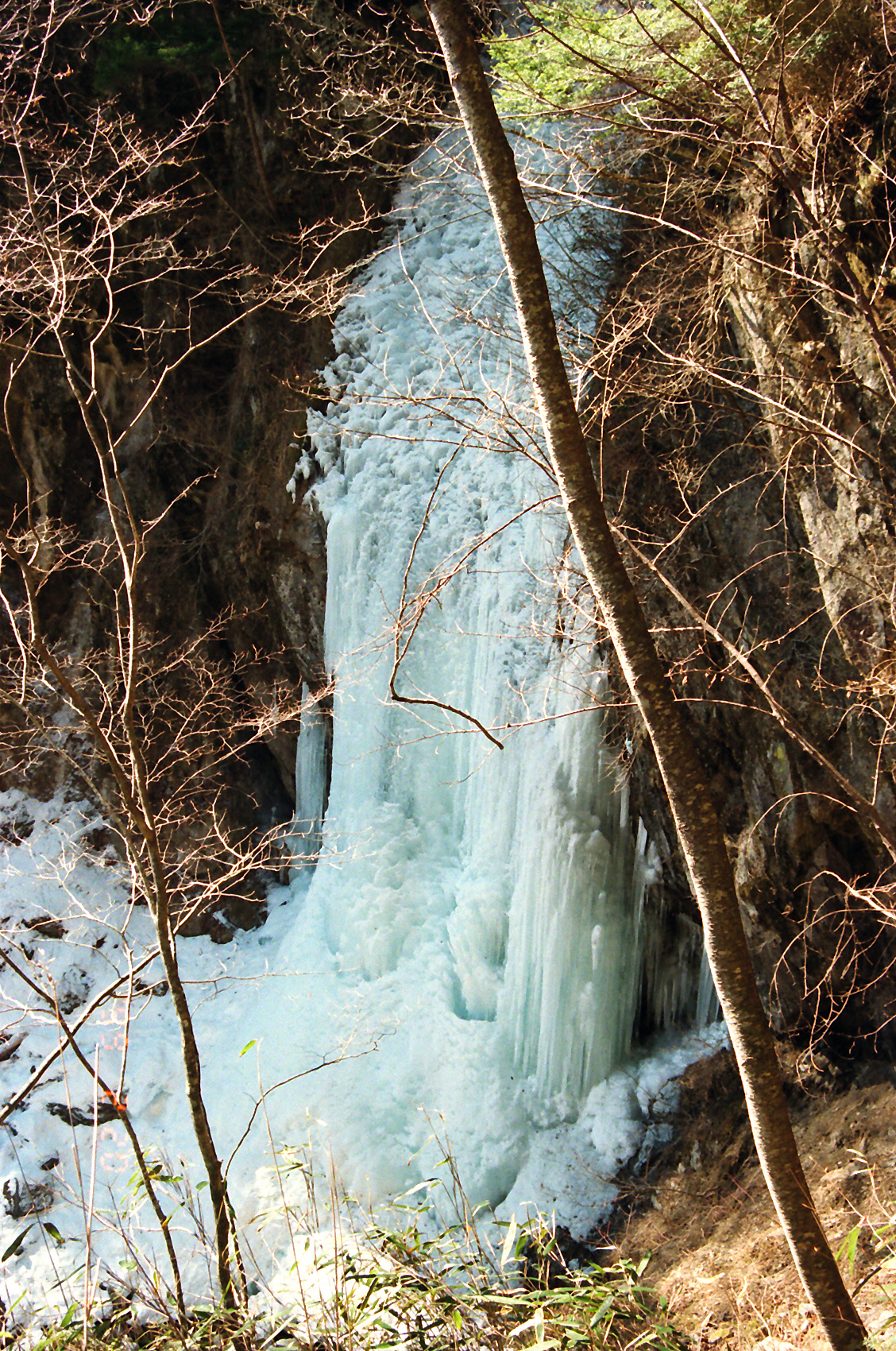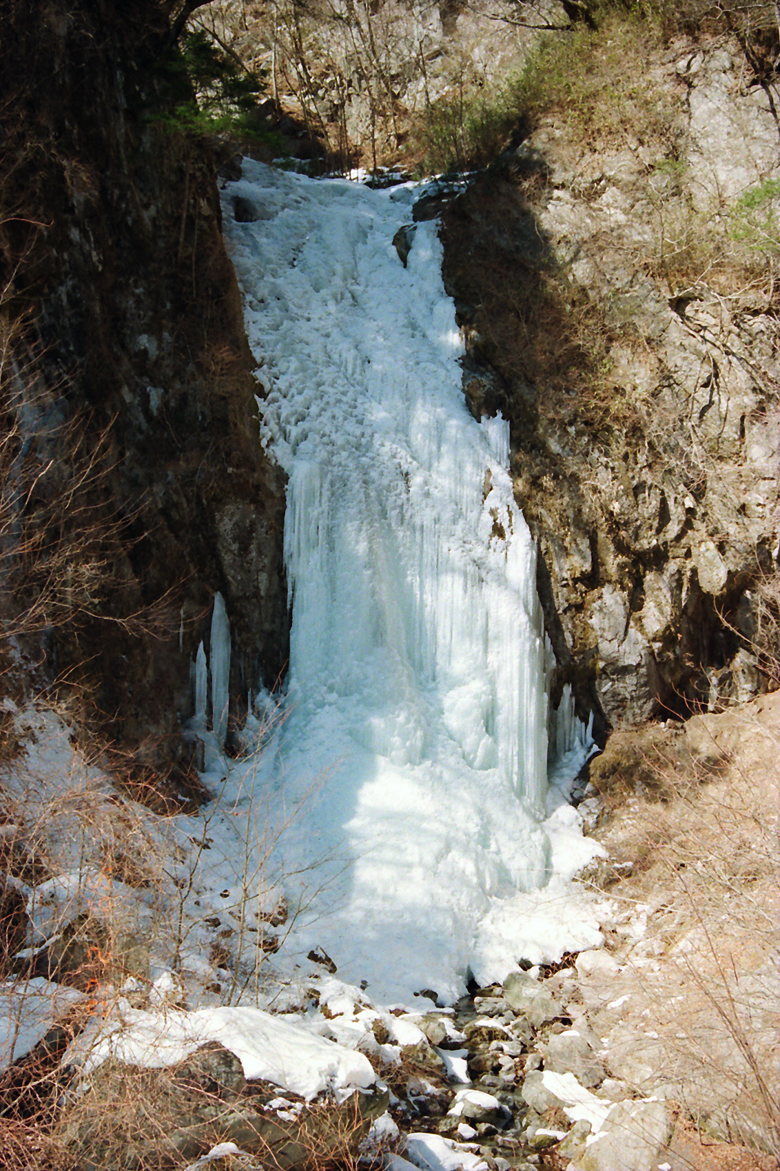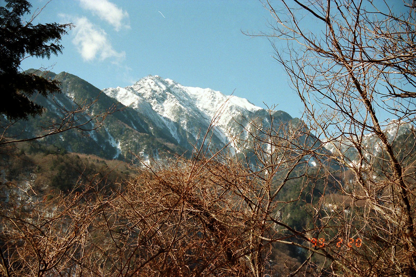| 林道から見あげると鳳凰三山が見えた。快晴で綺麗に見えた前日に東京はみぞれだったので雪があると思っていたが、韮崎は雪が降らなかったようで新雪はなかった。更に進むと甲斐駒ケ岳が望める。まだ山頂は雪が沢山ありました。林道は新雪が無かったので歩くのは楽だった。 林道の終点に着きました。錦滝です。小さな休憩所がありここで影山さんがコーヒをいれてくれました。滝まで降りて記念写真を撮る。 | |||||||