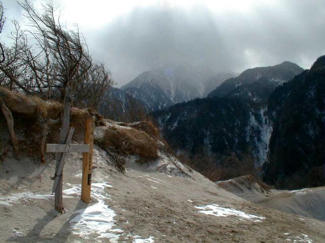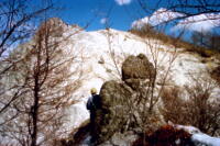| 錦滝の横から急坂を登る。途中からアイゼンを付けたりしながらやっと山頂近くの雁が原に達する。花崗岩であたりが白い雪のような特別な雰囲気をもった場所です。 | |||||||