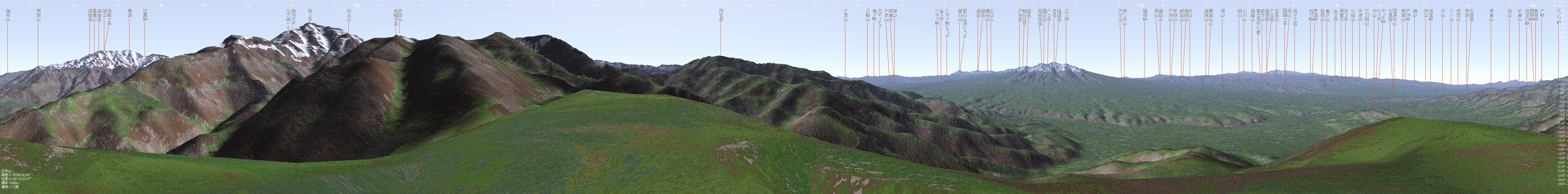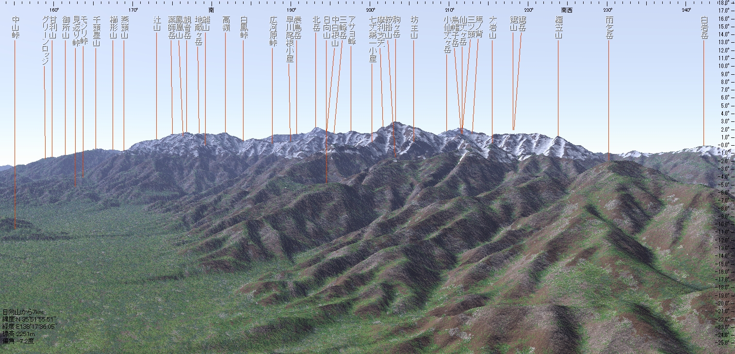 | 頂上から稜線を望む。左奥が甲斐駒ケ岳、 カシミールで作成・・・・日向山での360度擬似パノラマ、(3.8メガ)山の地名がわかります。細長い写真ですが展開図。 |