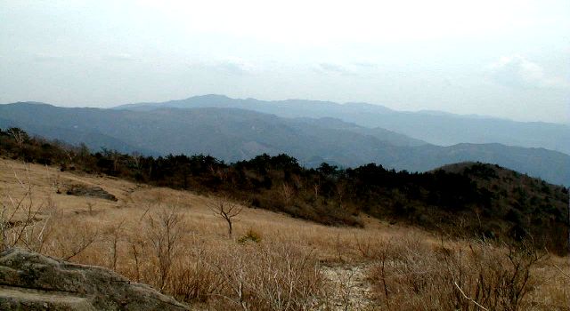 て乾徳山を眺める。右手の草の付いている急斜面を登る。急斜面を登り振り返ると南アルプスが見える予定だったが霞のため遠くは見えなかった。 ここの場所は扇平。写真の中心部に笠取山が見えています。