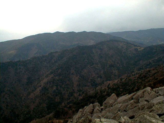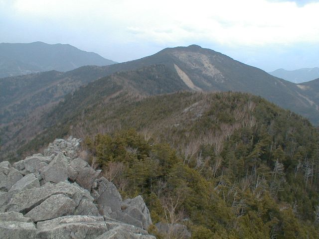 頂上から黒金山への縦走路。目の前のピークまではさらに2時間かかります。そのさらに先に西沢渓谷の不動滝へと続きます。今回は、天気が良かったので360度の展望を楽しめました。