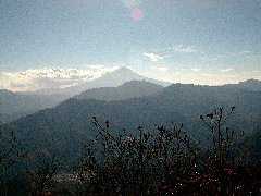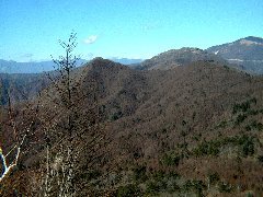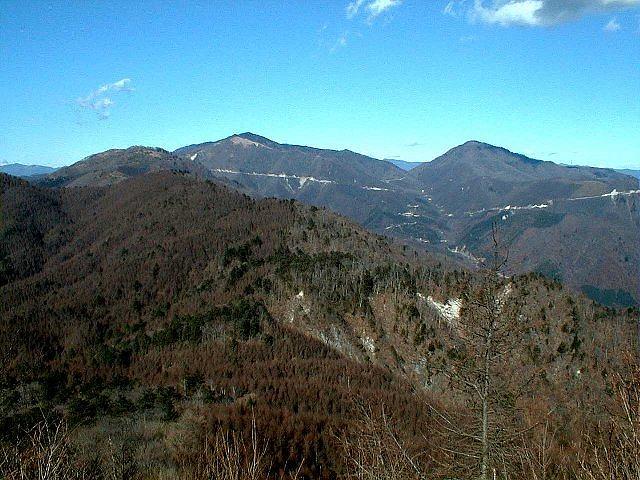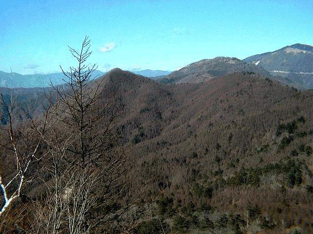| この下の写真は、昨年に撮影した物です。今回は、ガスがかかりはっきり写らないので、こちらを掲載します。左から大鹿山1236m、大岩ケ丸1644m、右奥が前回登った、雁ケ腹摺山です。今年度の計画に掲載してあります。大峠が見えます。前回は、大月の駅から車でここまで上がりました。林道が、結構使えます。 |