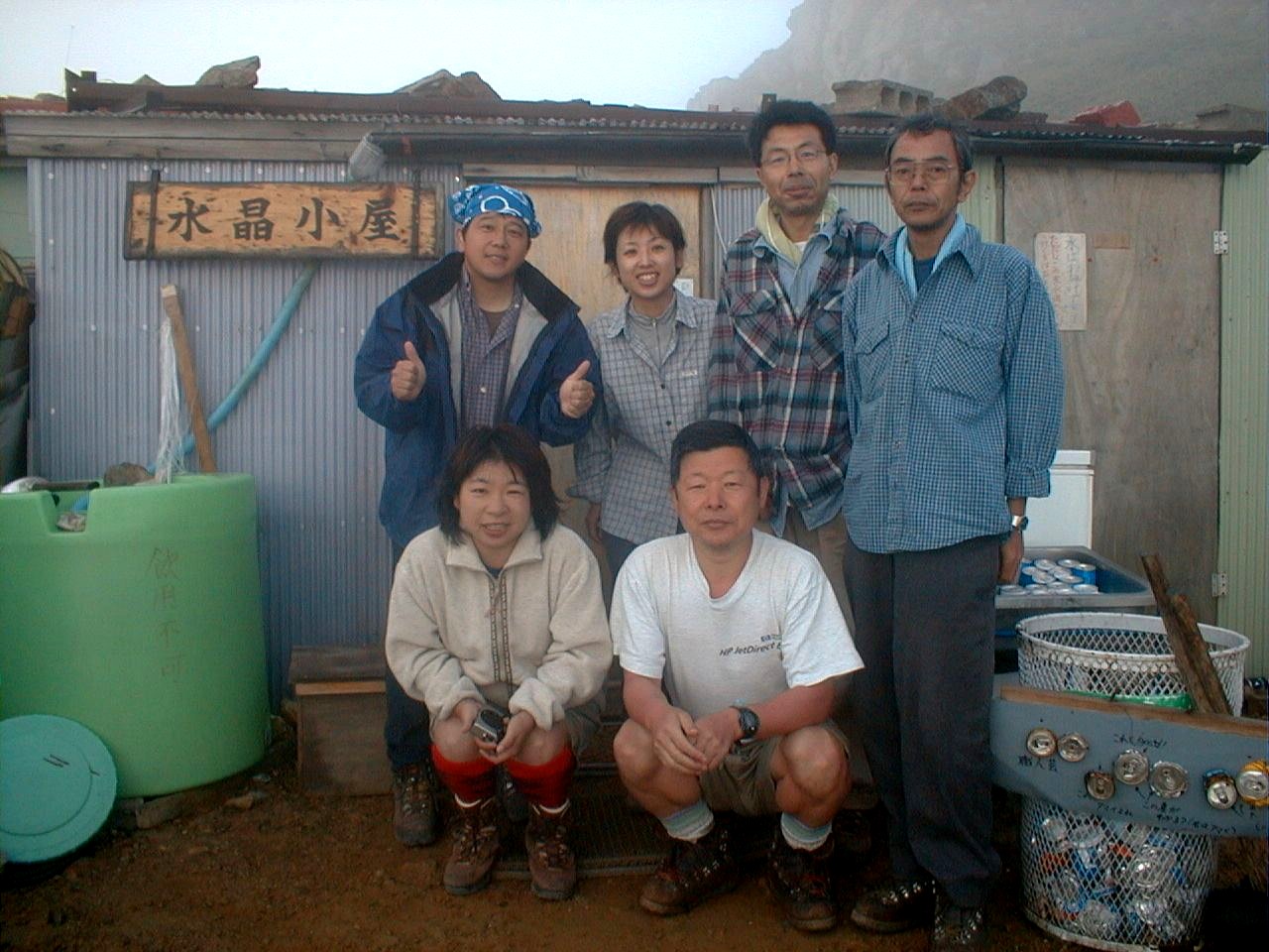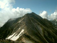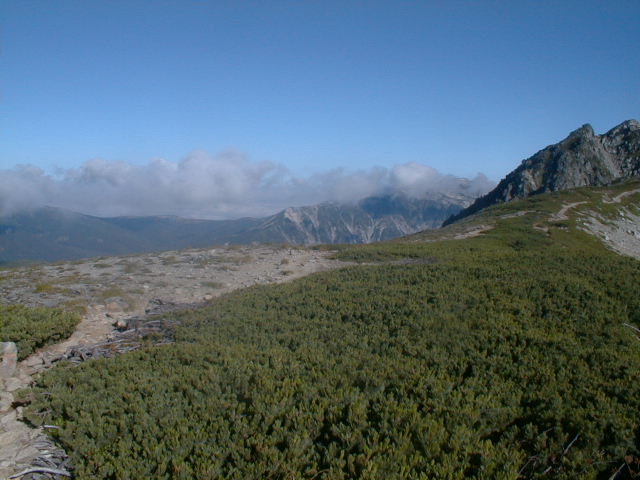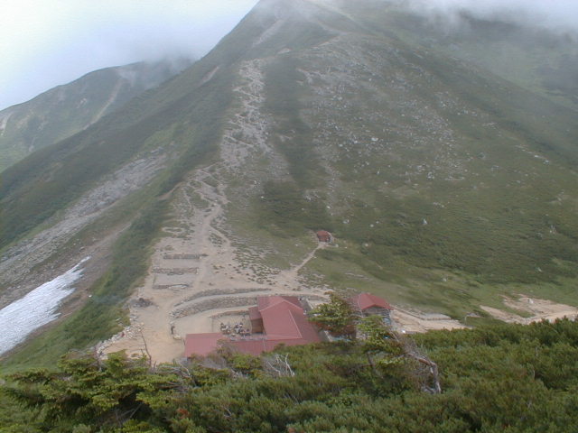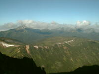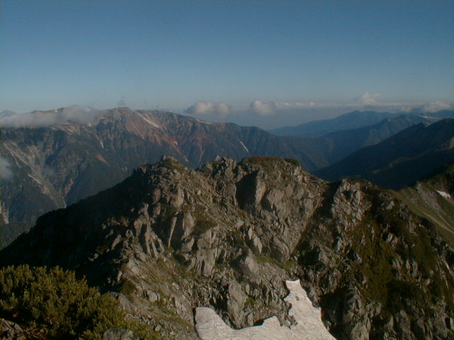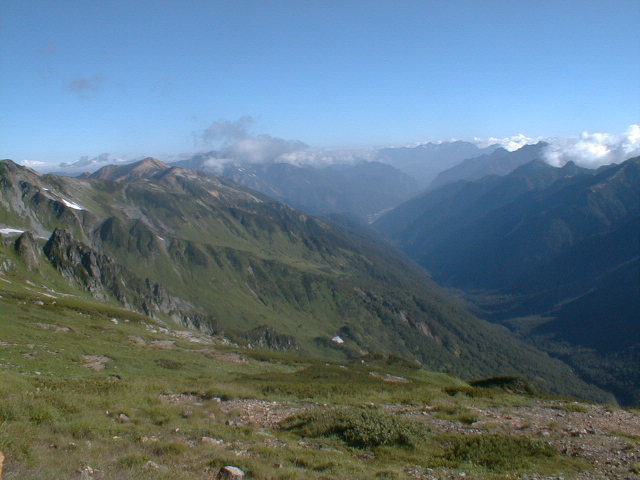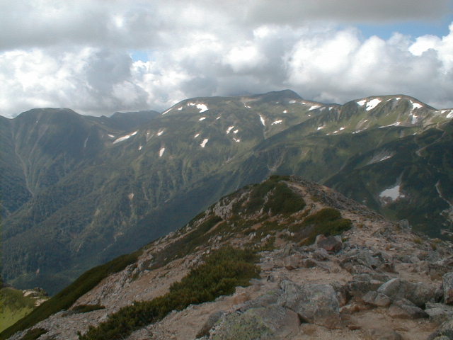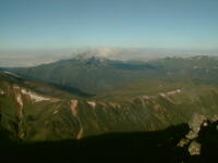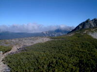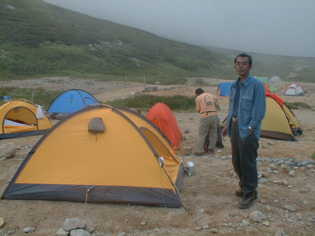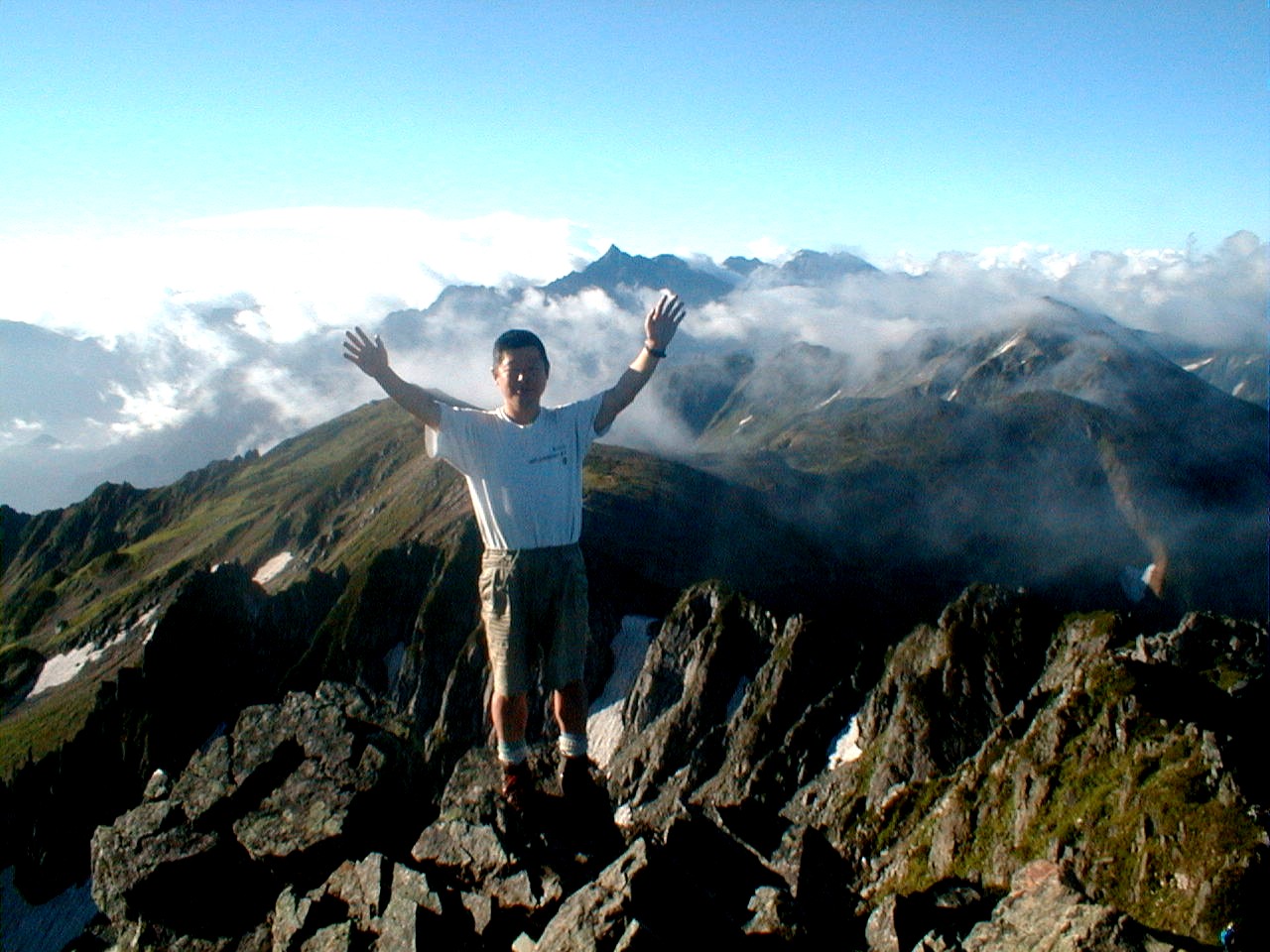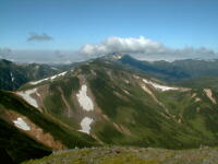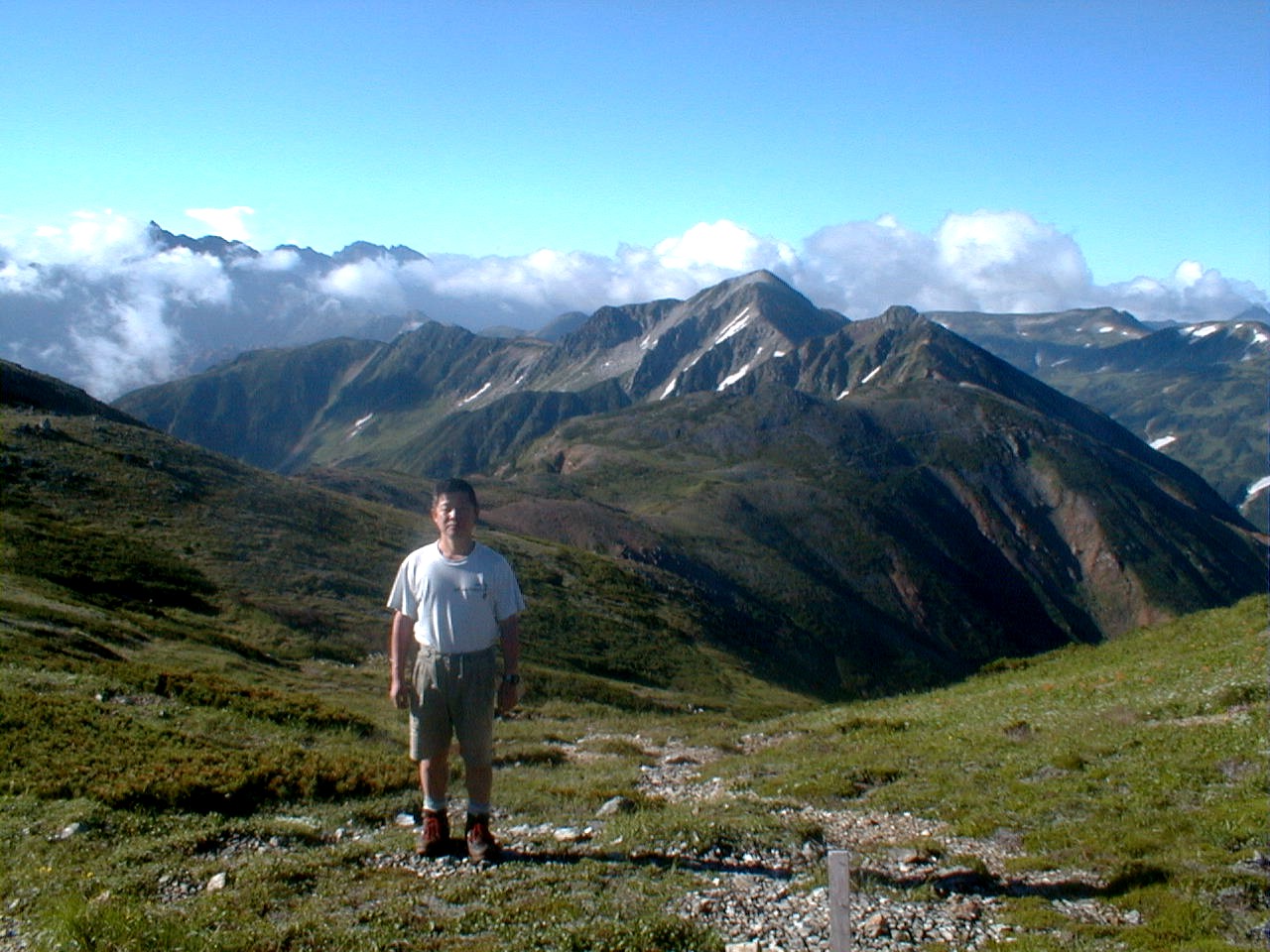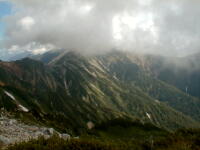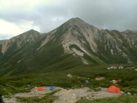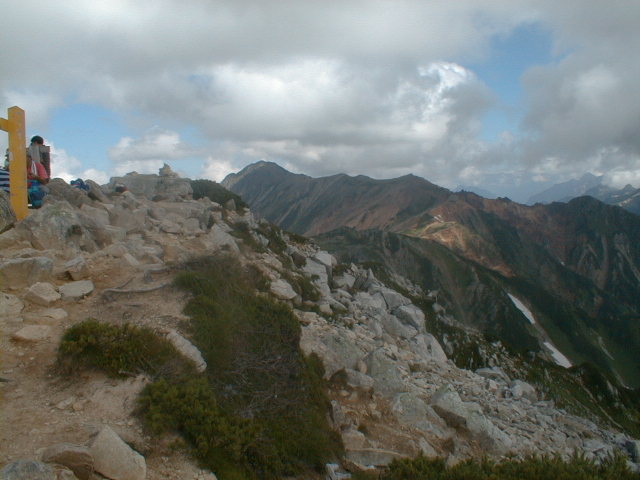 7時、北アルプス核心部に登る。周りの山が全て見えました。大天井岳、槍ヶ岳、双六岳、笠ヶ岳、穂高、雲の平、黒部五郎岳、薬師岳、立山、白馬、鹿島槍、野口五郎、表銀座・・・・パノラマにしました。小屋に戻り今回、一緒に歩いて来たグループと集合写真。8時、水晶小屋を後にする。今日も天気が良く、だいぶ日焼けをしてしまった。9時30分、鷲羽岳の山頂。ここでも360度の展望、若干、ガスが出始めた。10時50分、三俣山荘に着く。日差しが強いので、すごく暑かった。ここで、昼食。水が豊富な場所で、設備の整った山小屋。これから、三俣蓮華岳(12時50分)を上り、尾根を歩き、双六岳(14時30分)へ。15時45分、双六小屋のテント場。双六小屋では、生ビールがあった。驚き。この小屋も設備は最高。山に来るとどうしても、夜は早くなる。夕食し、そうそうに寝てしまった。真夜中にテントから出て、星を見る。今日は、水晶小屋の時よりか、よく見えた。
