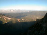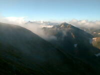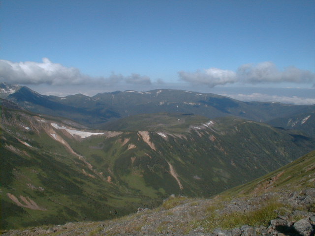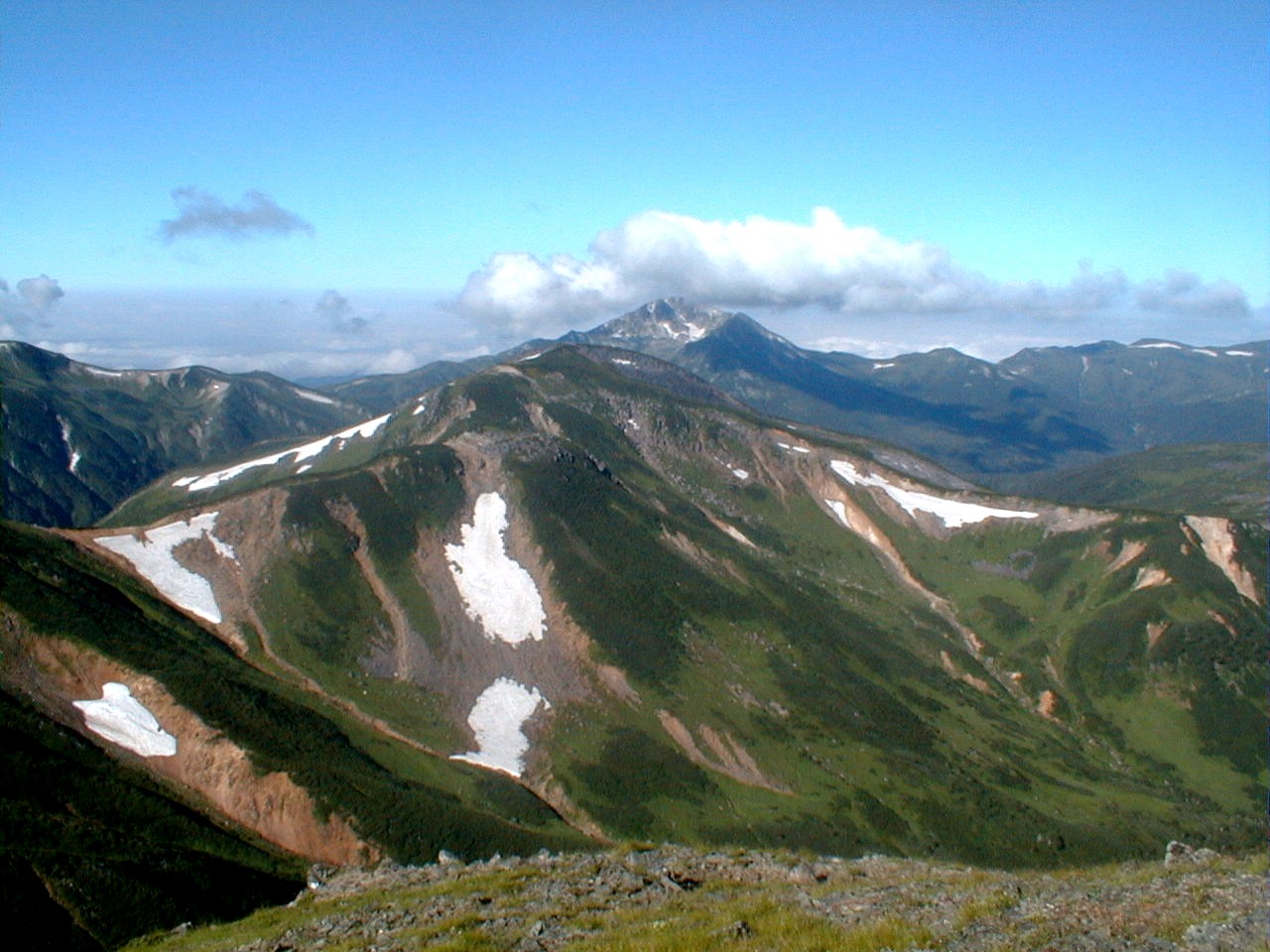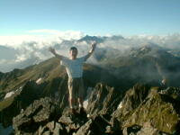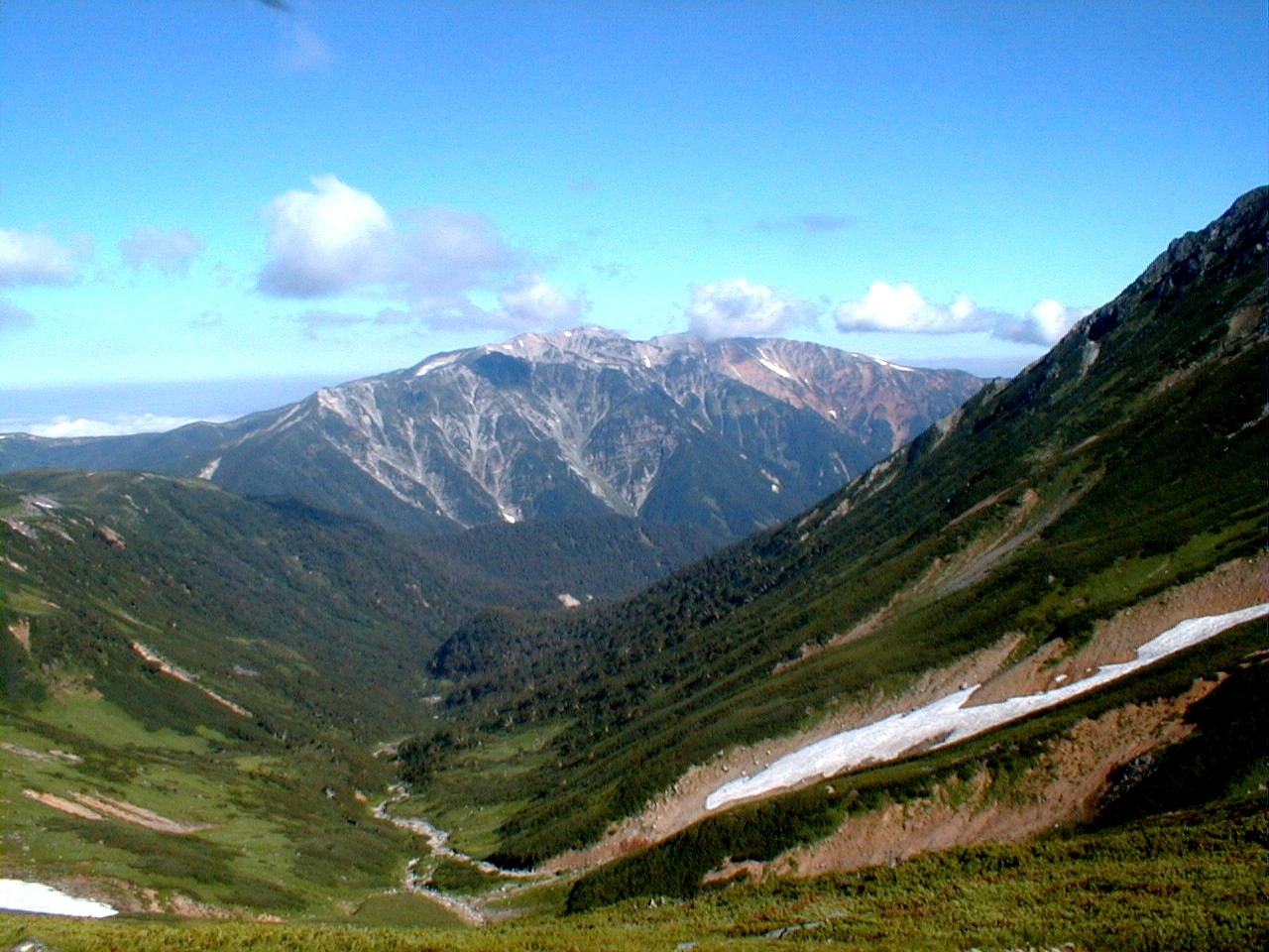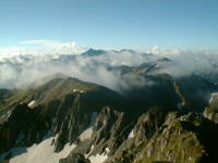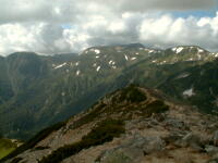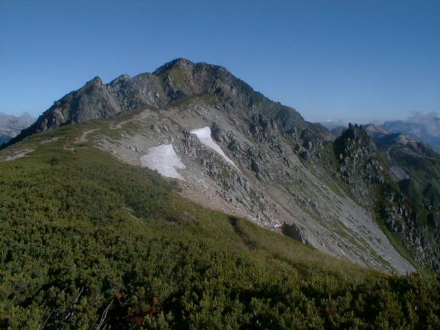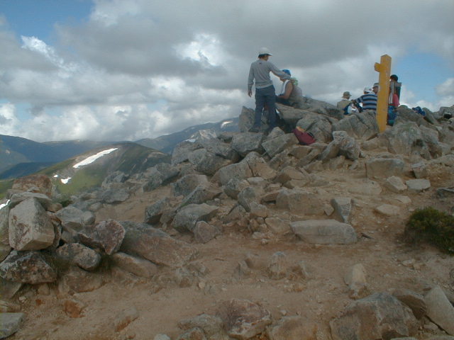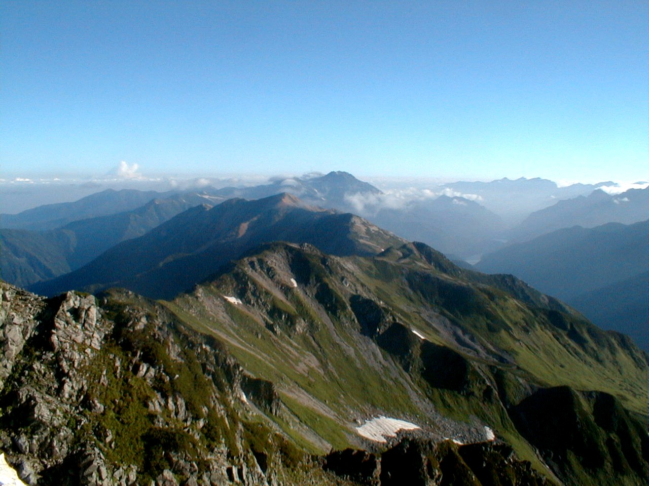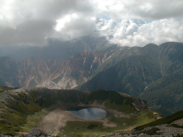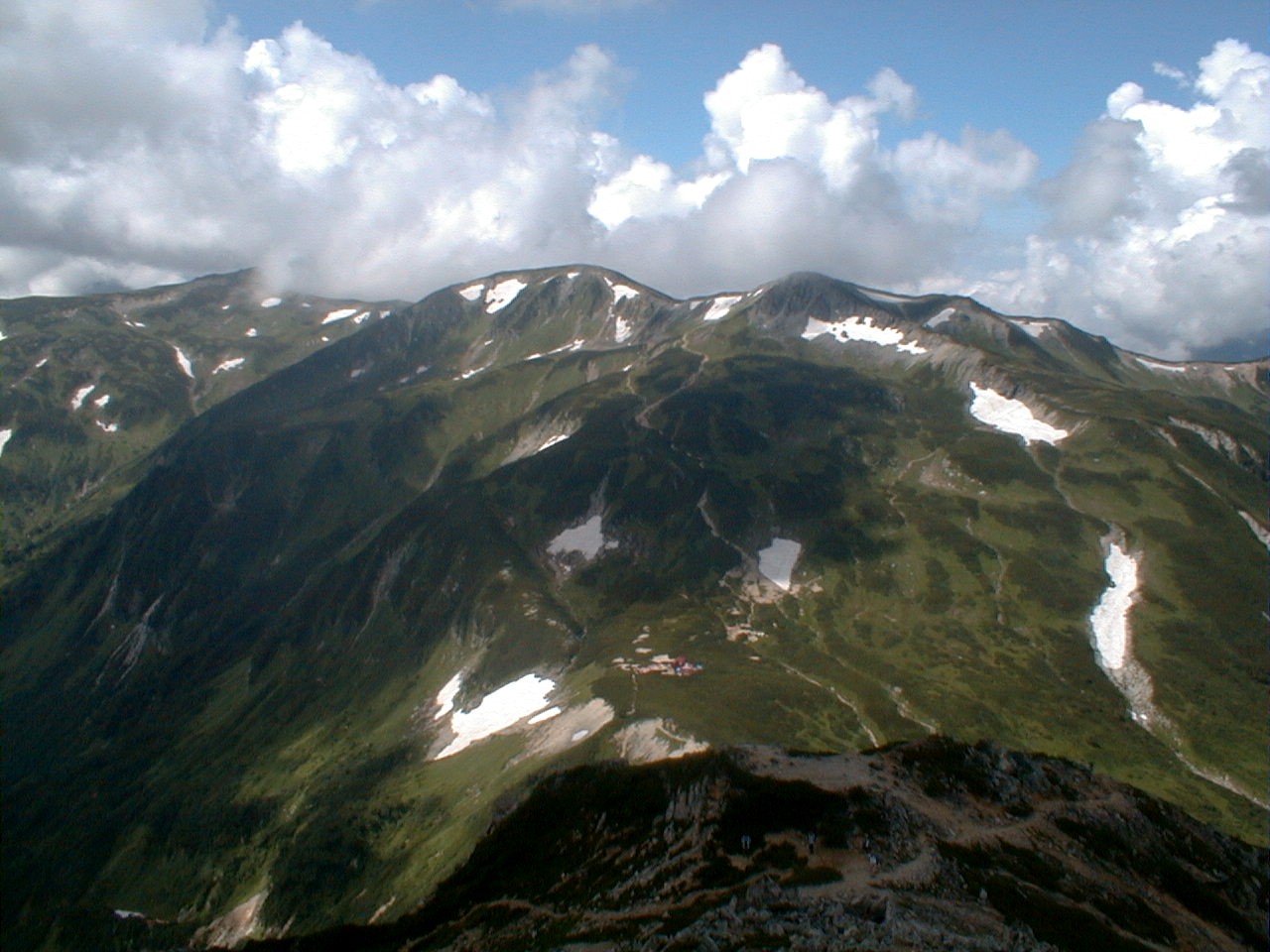 7時、北アルプス核心部に登る。周りの山が全て見えました。大天井岳、槍ヶ岳、双六岳、笠ヶ岳、穂高、雲の平、黒部五郎岳、薬師岳、立山、白馬、鹿島槍、野口五郎、表銀座・・・・パノラマにしました。小屋に戻り今回、一緒に歩いて来たグループと集合写真。8時、水晶小屋を後にする。今日も天気が良く、だいぶ日焼けをしてしまった。9時30分、鷲羽岳の山頂。ここでも360度の展望、若干、ガスが出始めた。10時50分、三俣山荘に着く。日差しが強いので、すごく暑かった。ここで、昼食。水が豊富な場所で、設備の整った山小屋。これから、三俣蓮華岳(12時50分)を上り、尾根を歩き、双六岳(14時30分)へ。15時45分、双六小屋のテント場。双六小屋では、生ビールがあった。驚き。この小屋も設備は最高。山に来るとどうしても、夜は早くなる。夕食し、そうそうに寝てしまった。真夜中にテントから出て、星を見る。今日は、水晶小屋の時よりか、よく見えた。