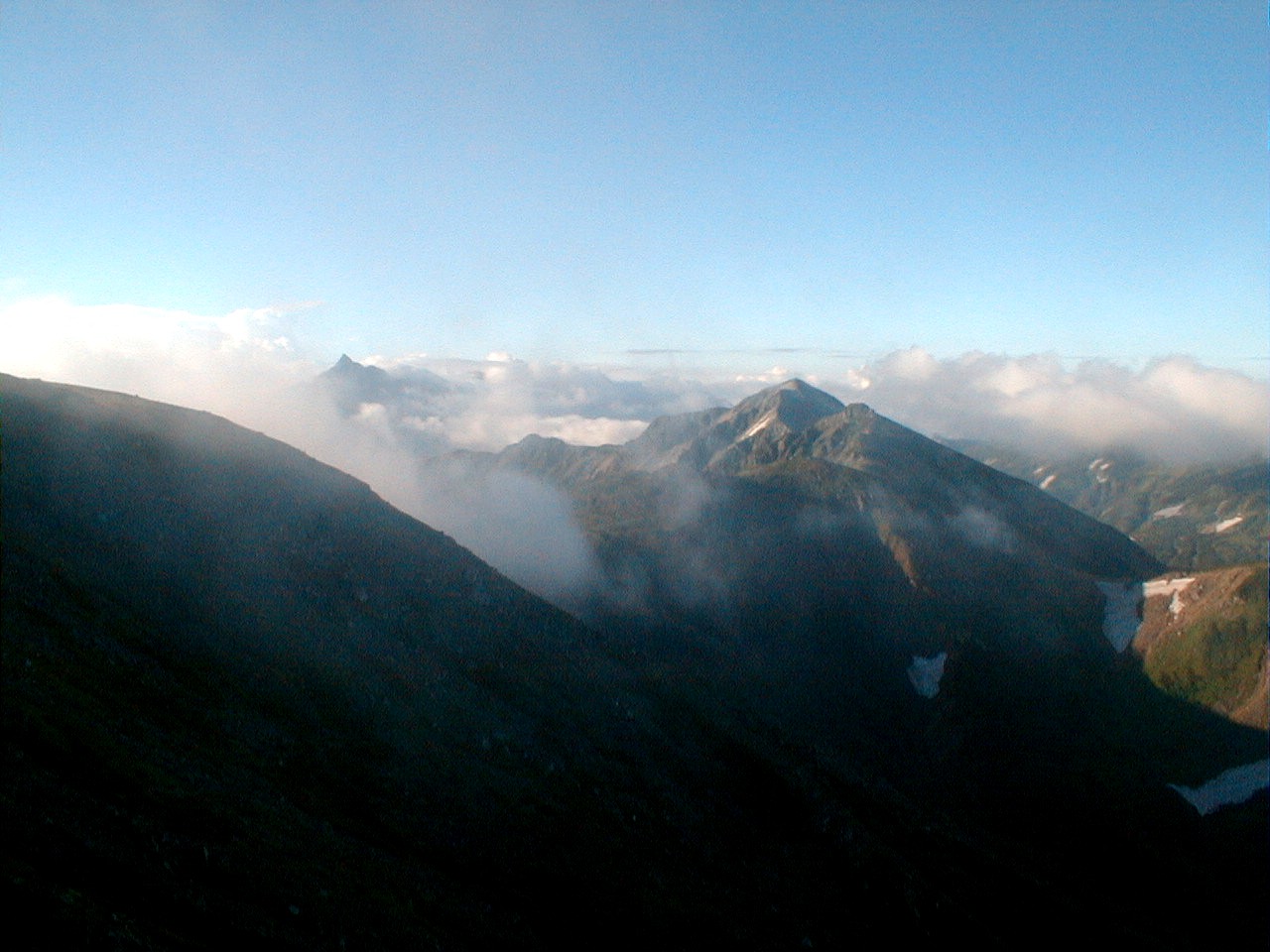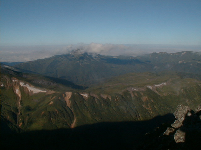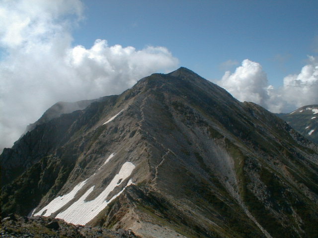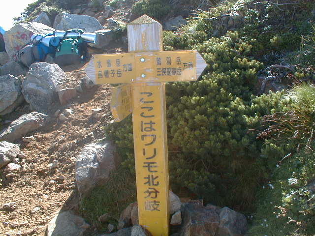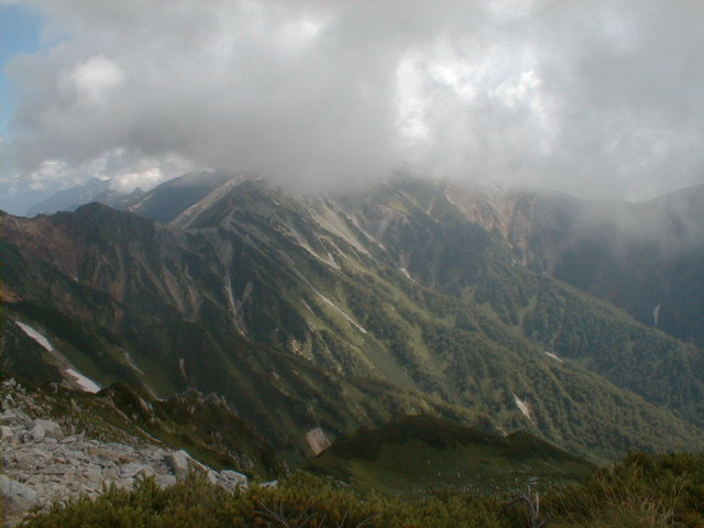 朝、御来光を期待して、5時から表で待ったがガスで見れなかった。朝食を作り6時にカメラだけで水晶岳へ向かう。途中から、日差しが感じられ、ガスがどんどん消えていき、水晶岳山頂では、360度の展望。