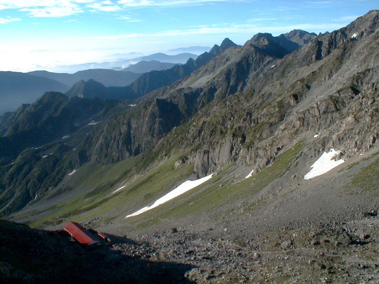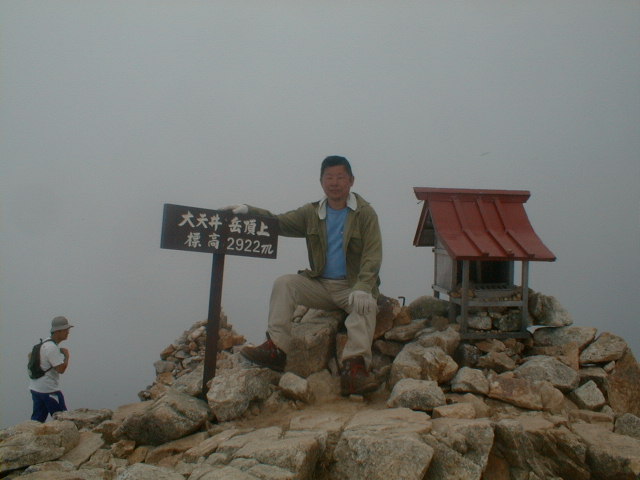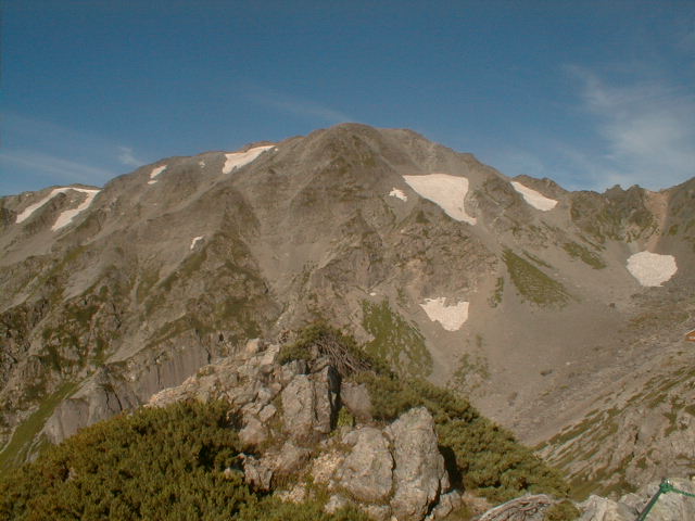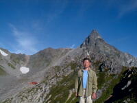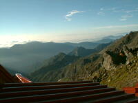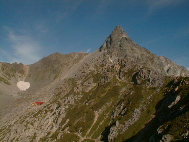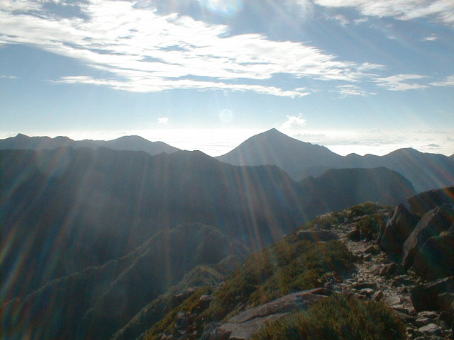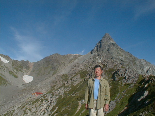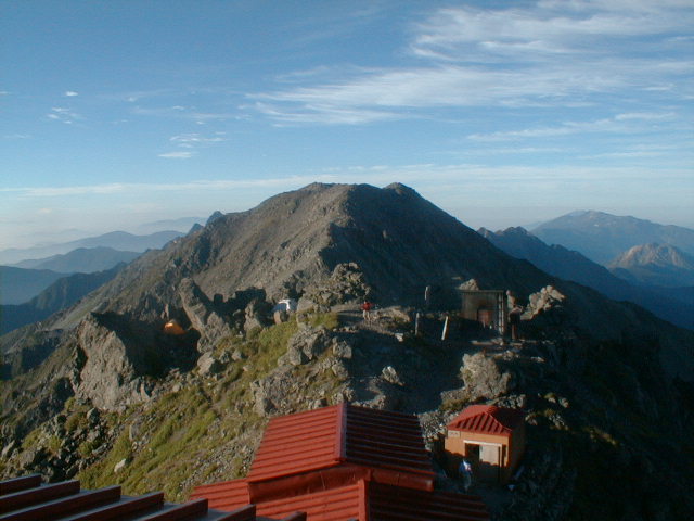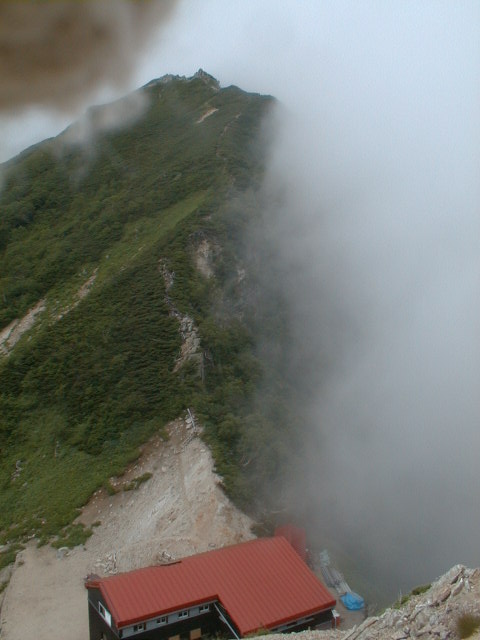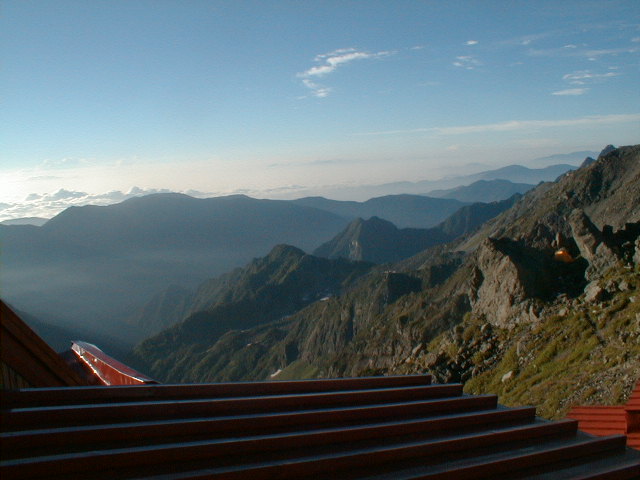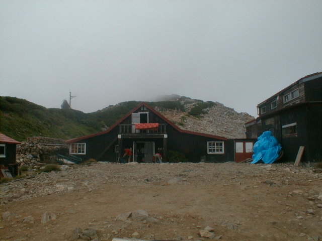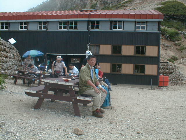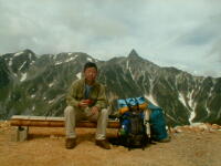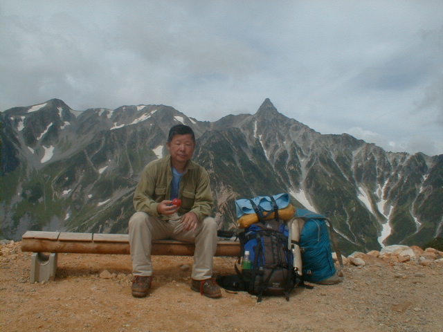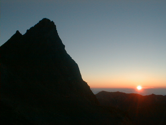 朝から、小屋の中はバタバタしていました。3時になると、槍ヶ岳の頂上で御来光を見ようと、準備が始まるからです。我々は、小屋の前で見るつもりでいたので、ゆっくり。4時30分、薄明かりの中、小屋の前で、御来光を待つ。槍ヶ岳の斜面には、ヘッドライトの列がつながっている。頂上は、30人も立てないので、先が一杯になると、進まなくなり、せっかく早起きしても、裏側の斜面でご来光も見れない。5時8分、今回の中で最もきれいな御来光。朝は、ガスもなく、快晴で、周りの山が良く見えた。小屋に戻り、朝食をすませる。6時、出発。ヒュッテ大槍までは、槍ヶ岳の真下を通過する感覚で、下に槍沢を見ながら歩く快適なコース。ヒュッテのテラスで、槍をバックに記念写真。ここから先が、大変になる。数年前の大地震で、崩落して、崩れたところが多いので、コースが、厳しくなっている。特に、はしごの5段連結の直登20mは、きつかった。このコースは表銀座と呼ばれるコースだが、とてもきつかった。急登の後、少しで西岳ヒュッテ(9時50分)。ここからの穂高から槍ヶ岳までのパノラマは素晴らしかった。ヒュッテで、トマトとジュースを買って、ゆっくり展望台で楽しむ。ここから大天井岳までは、2時間30分。少しガスが出始めた。13時30分、だらだらした縦走路を歩き、途中で昼食。やっと、大天井ヒュッテに着く。あとは、大天井岳までの登りがあと、わずか。14時30分、大天井山頂小屋に着く。小屋の食事は魚と肉と2種類の選択があり、魚のほうをお願いした。荷物を整理した、山頂に登った。ガスの中で何も見えなかった。早めに着いたので、ホールでコーヒを作る。テレビでは甲子園の高校野球、ニュースでは三宅島火山爆発。今夜も、真夜中に起き出して、星を見た。