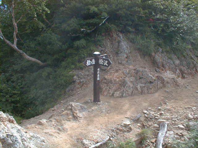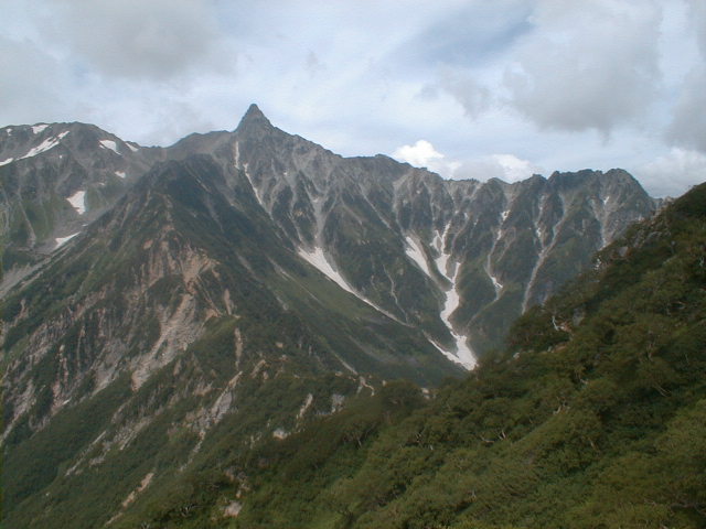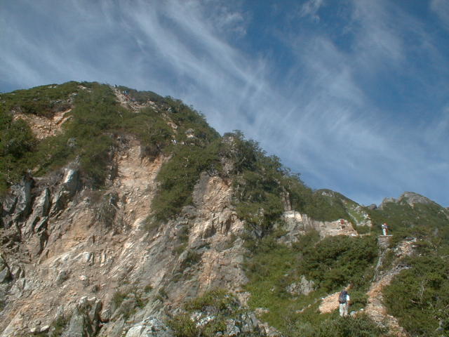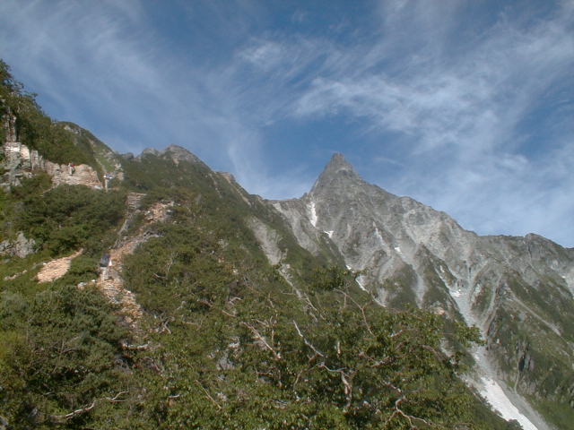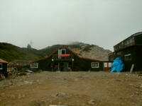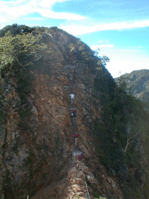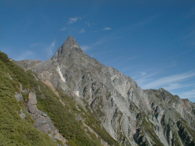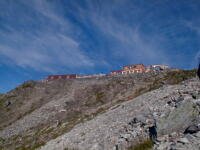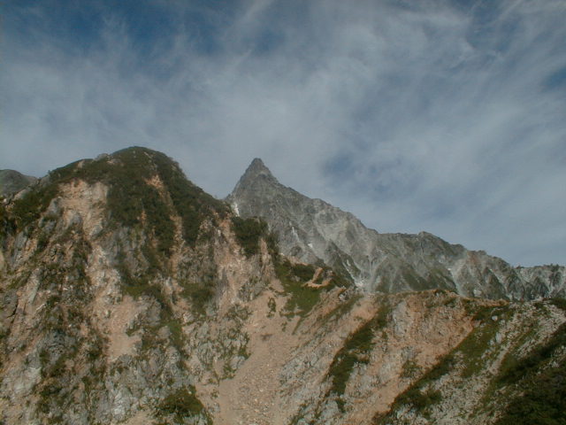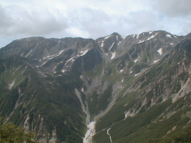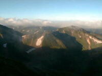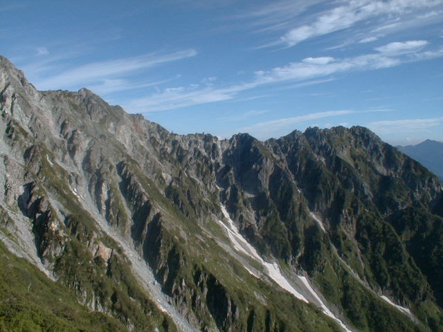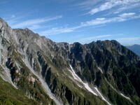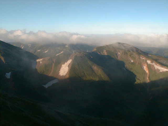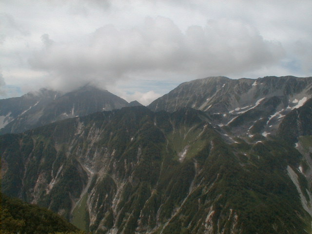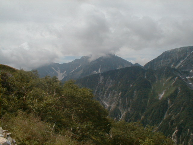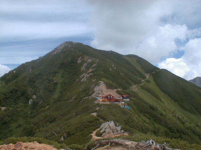 朝から、小屋の中はバタバタしていました。3時になると、槍ヶ岳の頂上で御来光を見ようと、準備が始まるからです。我々は、小屋の前で見るつもりでいたので、ゆっくり。4時30分、薄明かりの中、小屋の前で、御来光を待つ。槍ヶ岳の斜面には、ヘッドライトの列がつながっている。頂上は、30人も立てないので、先が一杯になると、進まなくなり、せっかく早起きしても、裏側の斜面でご来光も見れない。5時8分、今回の中で最もきれいな御来光。朝は、ガスもなく、快晴で、周りの山が良く見えた。小屋に戻り、朝食をすませる。6時、出発。ヒュッテ大槍までは、槍ヶ岳の真下を通過する感覚で、下に槍沢を見ながら歩く快適なコース。ヒュッテのテラスで、槍をバックに記念写真。ここから先が、大変になる。数年前の大地震で、崩落して、崩れたところが多いので、コースが、厳しくなっている。特に、はしごの5段連結の直登20mは、きつかった。このコースは表銀座と呼ばれるコースだが、とてもきつかった。急登の後、少しで西岳ヒュッテ(9時50分)。ここからの穂高から槍ヶ岳までのパノラマは素晴らしかった。ヒュッテで、トマトとジュースを買って、ゆっくり展望台で楽しむ。ここから大天井岳までは、2時間30分。少しガスが出始めた。13時30分、だらだらした縦走路を歩き、途中で昼食。やっと、大天井ヒュッテに着く。あとは、大天井岳までの登りがあと、わずか。14時30分、大天井山頂小屋に着く。小屋の食事は魚と肉と2種類の選択があり、魚のほうをお願いした。荷物を整理した、山頂に登った。ガスの中で何も見えなかった。早めに着いたので、ホールでコーヒを作る。テレビでは甲子園の高校野球、ニュースでは三宅島火山爆発。今夜も、真夜中に起き出して、星を見た。