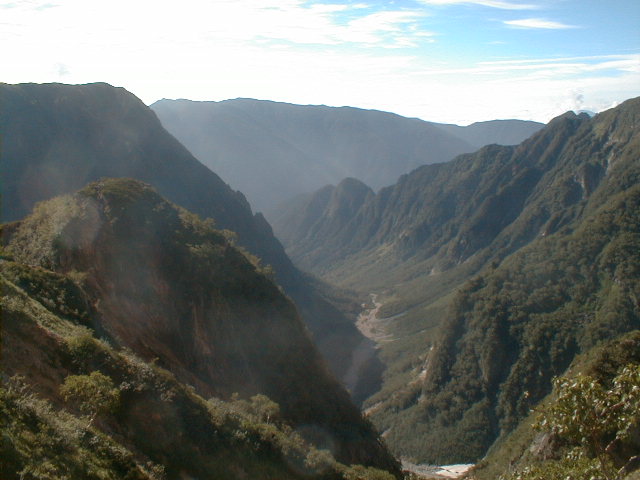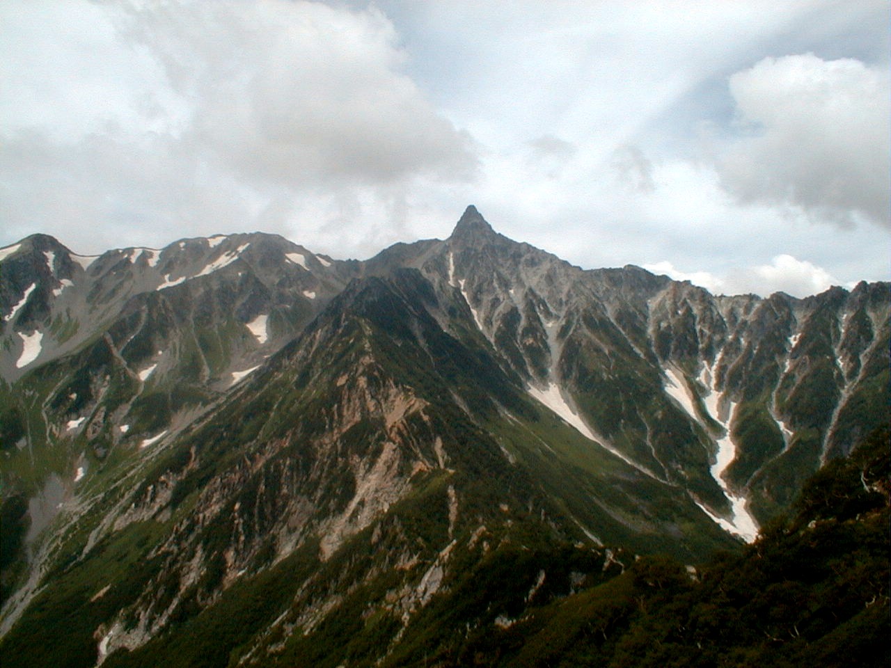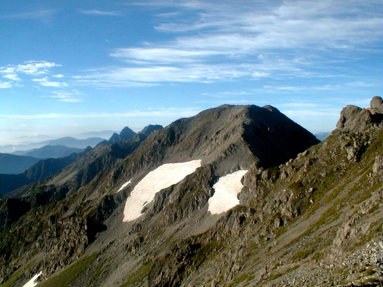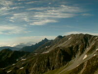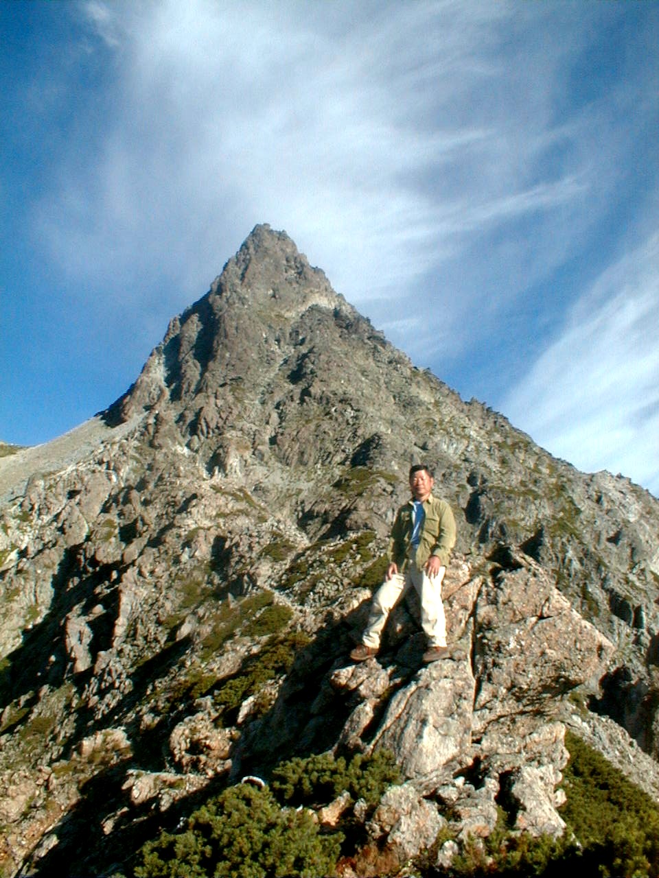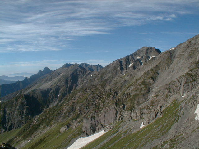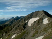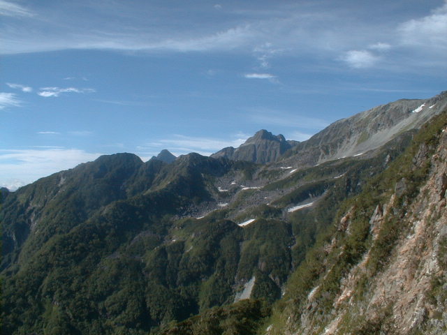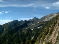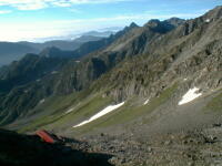朝から、小屋の中はバタバタしていました。3時になると、槍ヶ岳の頂上で御来光を見ようと、準備が始まるからです。我々は、小屋の前で見るつもりでいたので、ゆっくり。4時30分、薄明かりの中、小屋の前で、御来光を待つ。槍ヶ岳の斜面には、ヘッドライトの列がつながっている。頂上は、30人も立てないので、先が一杯になると、進まなくなり、せっかく早起きしても、裏側の斜面でご来光も見れない。5時8分、今回の中で最もきれいな御来光。朝は、ガスもなく、快晴で、周りの山が良く見えた。小屋に戻り、朝食をすませる。6時、出発。ヒュッテ大槍までは、槍ヶ岳の真下を通過する感覚で、下に槍沢を見ながら歩く快適なコース。ヒュッテのテラスで、槍をバックに記念写真。ここから先が、大変になる。数年前の大地震で、崩落して、崩れたところが多いので、コースが、厳しくなっている。特に、はしごの5段連結の直登20mは、きつかった。このコースは表銀座と呼ばれるコースだが、とてもきつかった。急登の後、少しで西岳ヒュッテ(9時50分)。ここからの穂高から槍ヶ岳までのパノラマは素晴らしかった。ヒュッテで、トマトとジュースを買って、ゆっくり展望台で楽しむ。ここから大天井岳までは、2時間30分。少しガスが出始めた。13時30分、だらだらした縦走路を歩き、途中で昼食。やっと、大天井ヒュッテに着く。あとは、大天井岳までの登りがあと、わずか。14時30分、大天井山頂小屋に着く。小屋の食事は魚と肉と2種類の選択があり、魚のほうをお願いした。荷物を整理した、山頂に登った。ガスの中で何も見えなかった。早めに着いたので、ホールでコーヒを作る。テレビでは甲子園の高校野球、ニュースでは三宅島火山爆発。今夜も、真夜中に起き出して、星を見た。