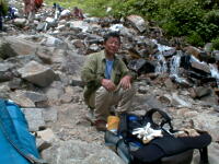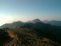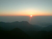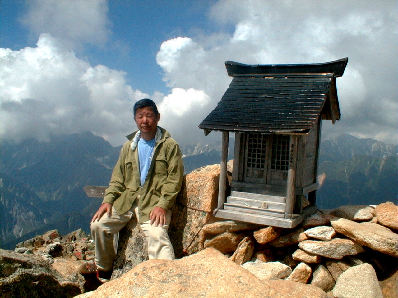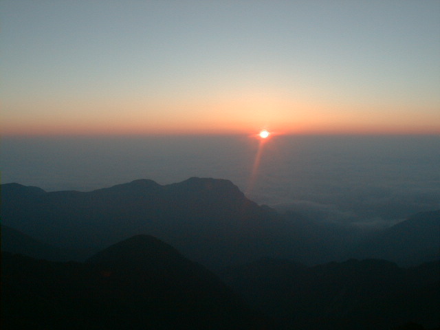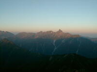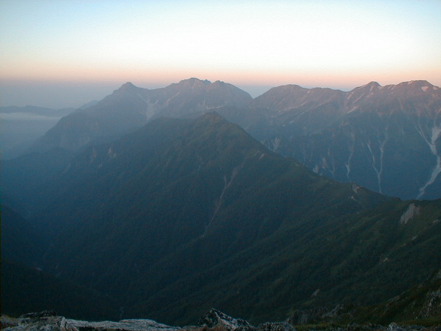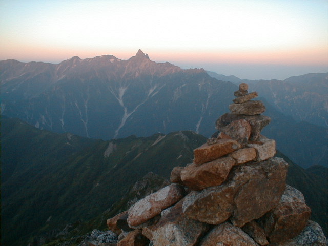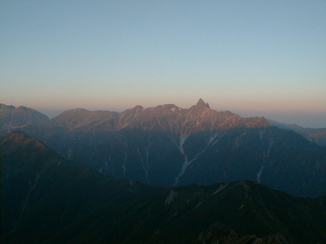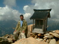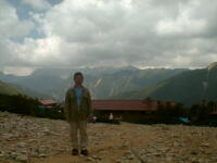 朝、5時6分、場所により時間がちょっと違うが、御来光があがる。後ろに穂高から槍ヶ岳、三俣蓮華、野口五郎岳、烏帽子岳と今回の縦走コースが全て見える。軽い朝靄がかかっているが、山が、日差しで赤く浮き上がって来る。6時10分、朝食を済ませ出発。天気もよく穂高を横に見ながらの稜線の散歩。最終日なので、槍ヶ岳から離れていくのが、ちょつと寂しい。8時30分、常念小屋に到着。小屋の前で、NHKの取材チームと小屋のスタッフで記念撮影をしていた。フルートの夕べと称する演奏会を前夜、やった模様。10時10分、常念岳頂上、残念ながらガスが巻いていて、展望は出来なかった。前に登った時と、今回では・・・・と関根君と昔話をする。10時50分、小屋に戻り下山準備。下山開始したら、丁度、上がってくるグループとすれ違いになった。一の沢林道コースは時間が短いが、とてもきついコースでした。2時50分やっとのおもいで、登山口の駐車場に到着。ここからは待っていたタクシーにのり、温泉に向かった。帰りは、JR穂高駅から松本に出て、そこから特急で帰った。