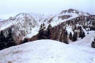 | 正面の、頂上と思われる大きな岩は、夏場は、鎖場で、チョクトウ出来るのですが、今は埋まっていて、右を巻いて登った。若干、危険があった。上りきると、少しで中ノ岳2144mのピーク。この時は、全くガスの中で視界不良。ここから右方面に武尊山へと続くのだがルートが見つからないので、ここで終わり。次の機会へ。下山途中に記念写真。今回は、ほとんど写真が撮れなくて残念。ガスのかなたに尾瀬が見える。至仏山と尾瀬ヶ原。 | |