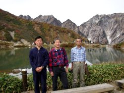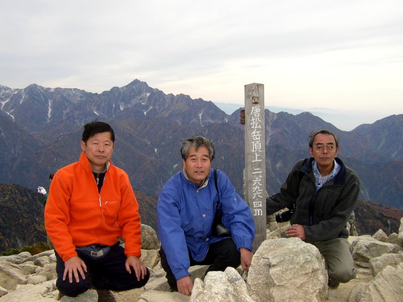 唐松岳山頂での記念写真。後方は剣岳。 |