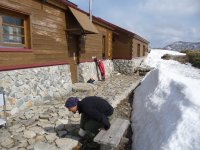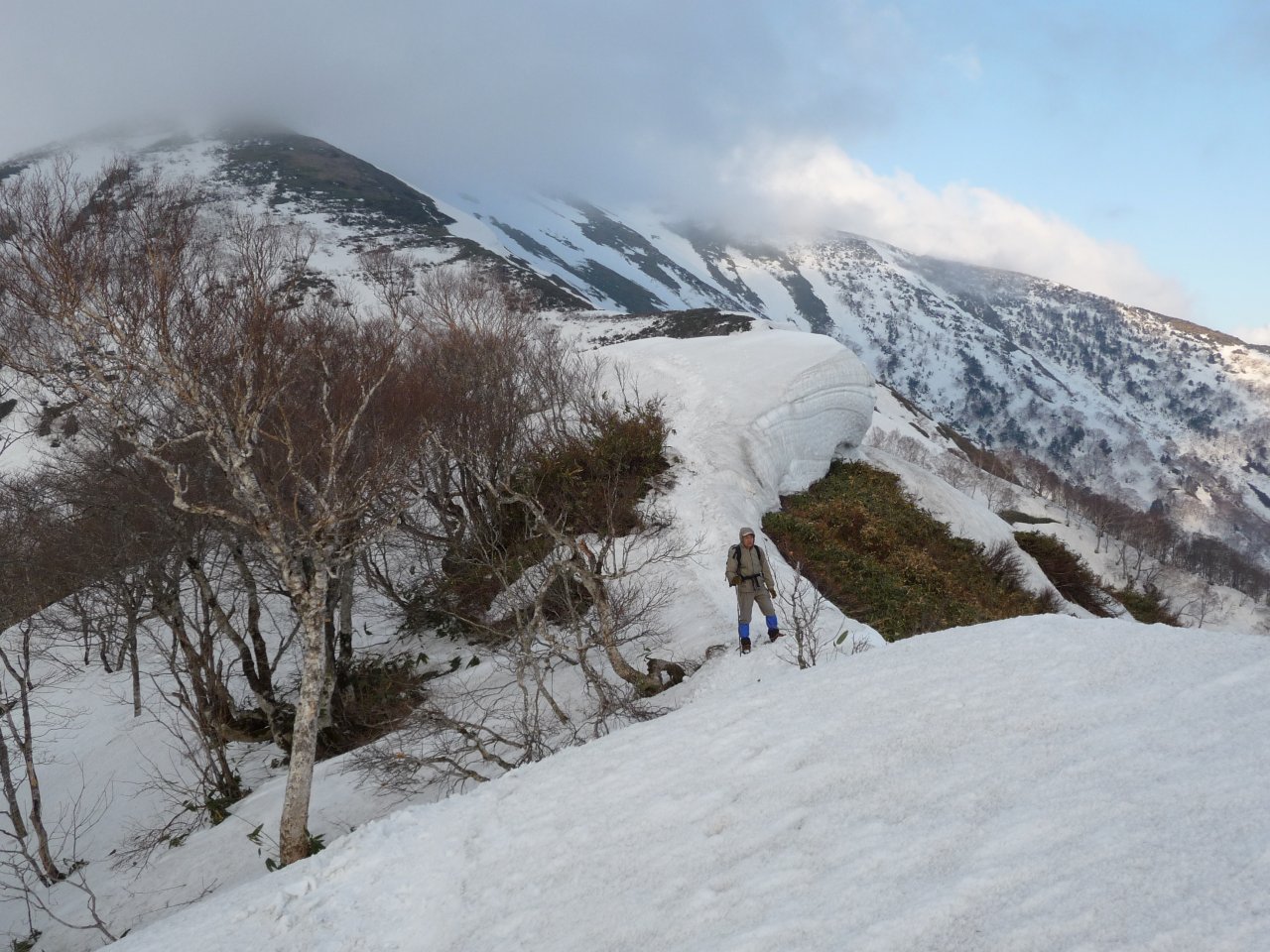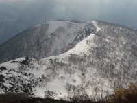 | 何とか頑張り、日帰りで登ってきました。上越はやはり雪が多い。駐車場を11時45分出発し、川沿いの林道を進む。途中までは天気は良かったが段々悪くなる。山の家に15時着。小屋の下の登山道は雪が多く、アイゼンを付けた。小屋から頂上へ向かう所から天気が崩れだす。ガスが出てルートが見えず風もあり、万太郎尾根に紛れないようにコンパスを見ながら進む。16時10分、頂上。ガスと雨に打たれながら稜線を進み松手山へ。やっと雨が止みガスが薄れだす。鉄塔までのコースが見える。一気に下るが途中で暗くなり大変だった。19時10分、駐車場へ戻る |